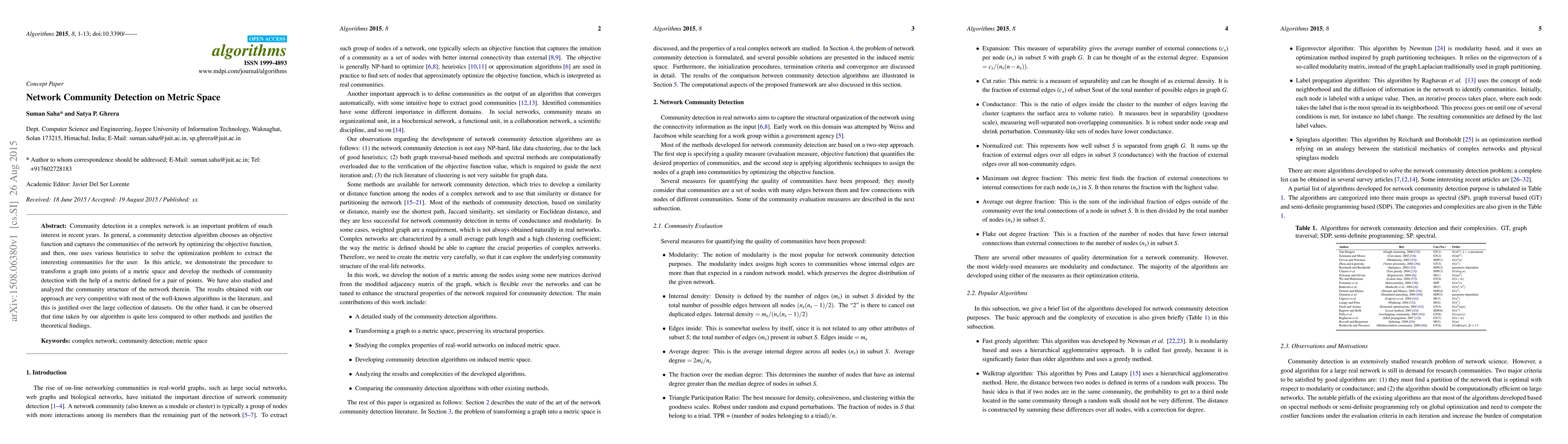 Community detection in a complex network is an important problem of much interest in recent years. In general, a community detection algorithm chooses an objective function and captures the communities of the network by optimizing the objective function, and then, one uses various heuristics to solve the optimization problem to extract the interesting communities for the user. In this article, we demonstrate the procedure to transform a graph into points of a metric space and develop the methods of community detection with the help of a metric defined for a pair of points. We have also studied and analyzed the community structure of the network therein. The results obtained with our approach are very competitive with most of the well-known algorithms in the literature, and this is justified over the large collection of datasets. On the other hand, it can be observed that time taken by our algorithm is quite less compared to other methods and justifies the theoretical findings.