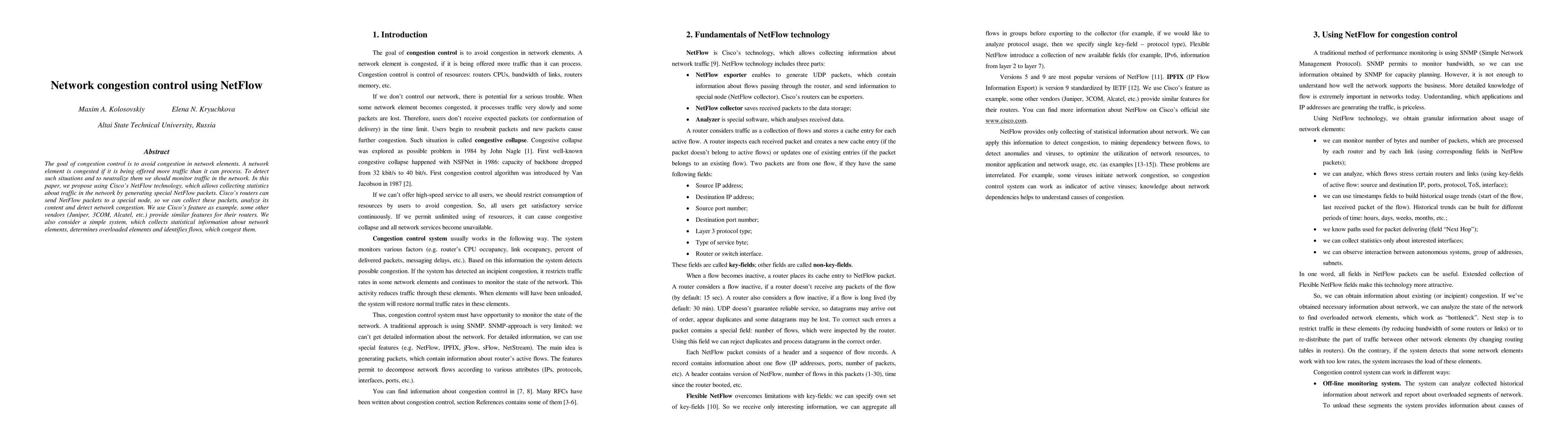 The goal of congestion control is to avoid congestion in network elements. A network element is congested if it is being offered more traffic than it can process. To detect such situations and to neutralize them we should monitor traffic in the network. In this paper, we propose using Cisco's NetFlow technology, which allows collecting statistics about traffic in the network by generating special NetFlow packets. Cisco's routers can send NetFlow packets to a special node, so we can collect these packets, analyze its content and detect network congestion. We use Cisco's feature as example, some other vendors (Juniper, 3COM, Alcatel, etc.) provide similar features for their routers. We also consider a simple system, which collects statistical information about network elements, determines overloaded elements and identifies flows, which congest them.