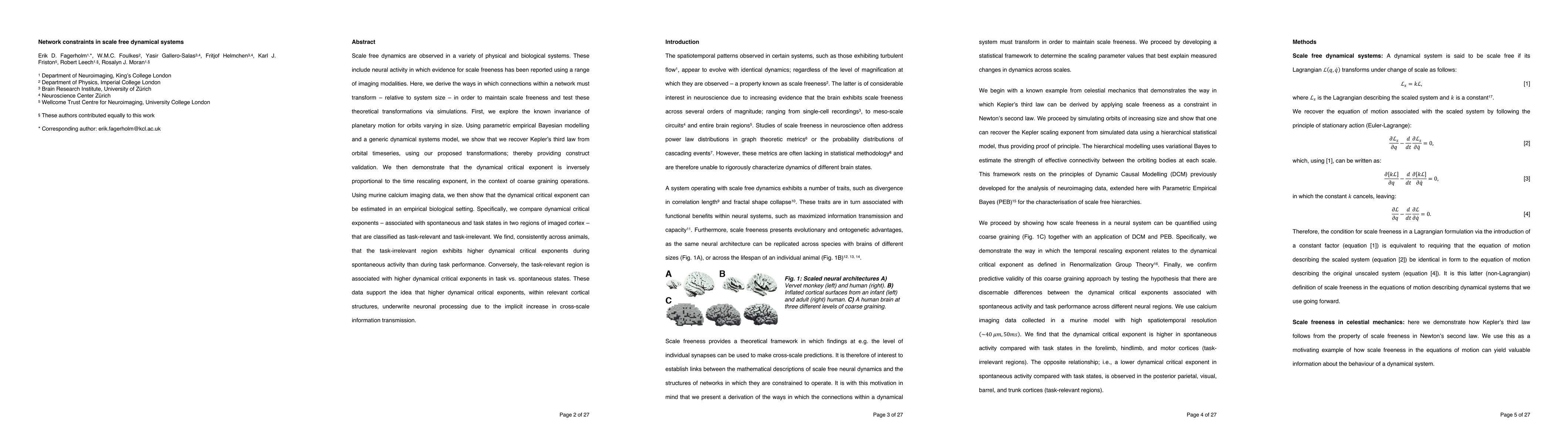 Scale free dynamics are observed in a variety of physical and biological systems. These include neural activity in which evidence for scale freeness has been reported using a range of imaging modalities. Here, we derive the ways in which connections within a network must transform - relative to system size - in order to maintain scale freeness and test these theoretical transformations via simulations. First, we explore the known invariance of planetary motion for orbits varying in size. Using parametric empirical Bayesian modelling and a generic dynamical systems model, we show that we recover Kepler's third law from orbital timeseries, using our proposed transformations; thereby providing construct validation. We then demonstrate that the dynamical critical exponent is inversely proportional to the time rescaling exponent, in the context of coarse graining operations. Using murine calcium imaging data, we then show that the dynamical critical exponent can be estimated in an empirical biological setting. Specifically, we compare dynamical critical exponents - associated with spontaneous and task states in two regions of imaged cortex - that are classified as task-relevant and task-irrelevant. We find, consistently across animals, that the task-irrelevant region exhibits higher dynamical critical exponents during spontaneous activity than during task performance. Conversely, the task-relevant region is associated with higher dynamical critical exponents in task vs. spontaneous states. These data support the idea that higher dynamical critical exponents, within relevant cortical structures, underwrite neuronal processing due to the implicit increase in cross-scale information transmission.