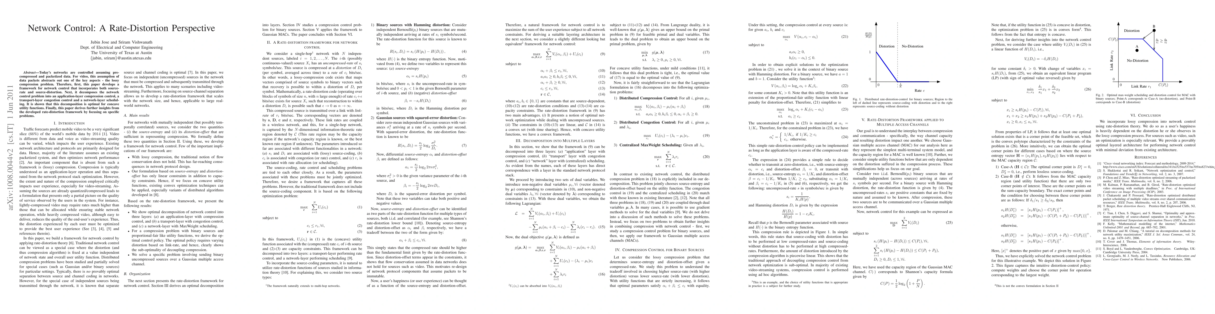 This paper proposes a network control framework that integrates source-rate and source-distortion, decomposing the control problem into application, transport, and network layers, and demonstrating optimality for concave utility functions. It further explores specific issues through the developed rate-distortion perspective.