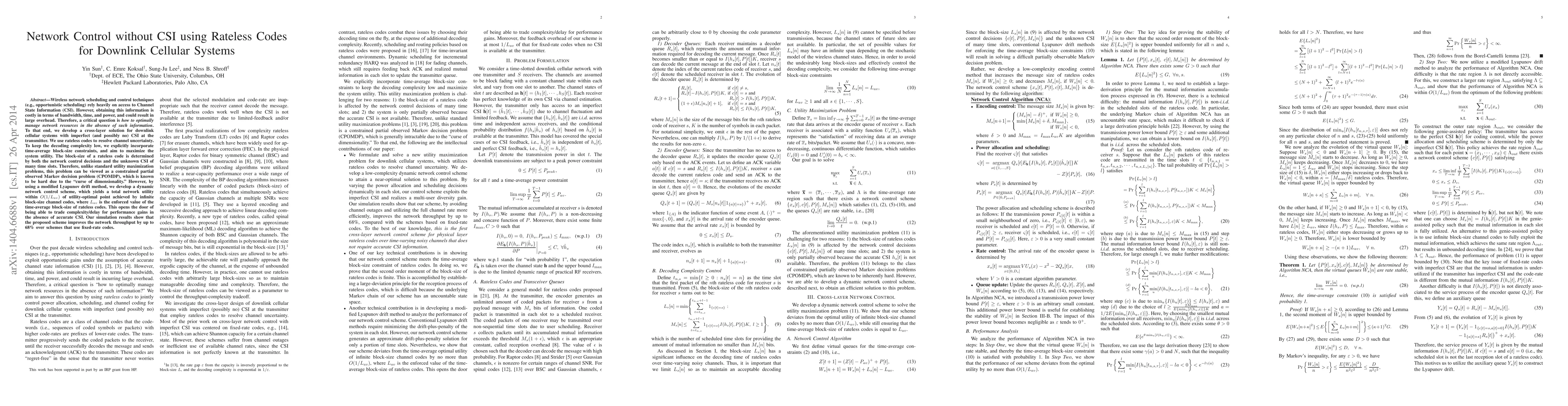 This paper proposes a cross-layer solution for downlink cellular systems that uses rateless codes to manage network resources without relying on Channel State Information (CSI). The developed dynamic control scheme, based on a modified Lyapunov drift method, achieves near-optimal network utility by trading complexity/delay for performance gains, improving throughput by up to 68% compared to fixed-rate code schemes.