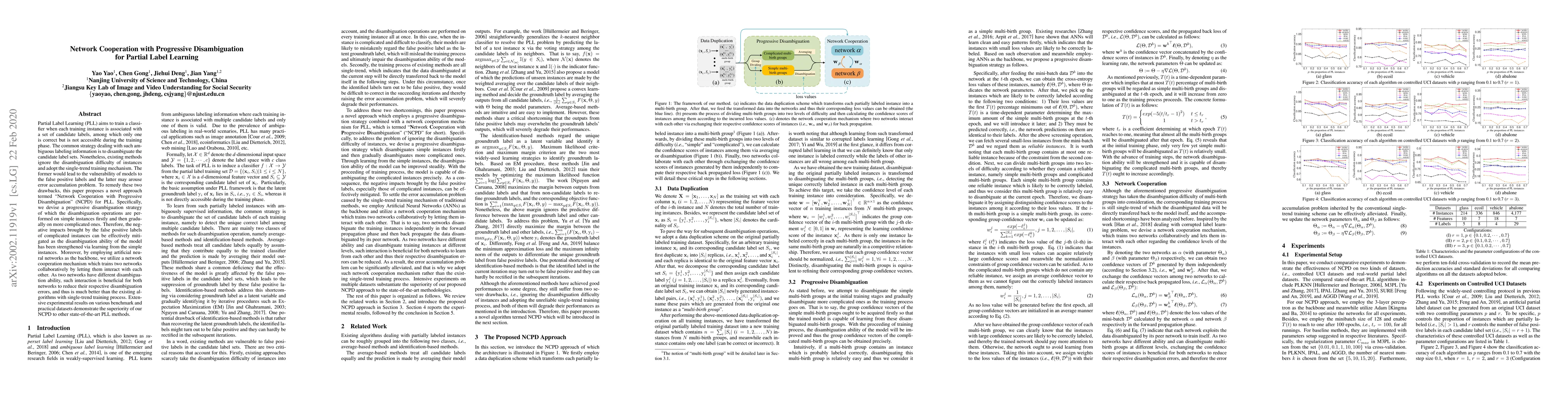 This paper proposes a novel approach called Network Cooperation with Progressive Disambiguation (NCPD) to improve Partial Label Learning, mitigating the effects of false positive labels and error accumulation, by training two networks collaboratively and progressively disambiguating instances.