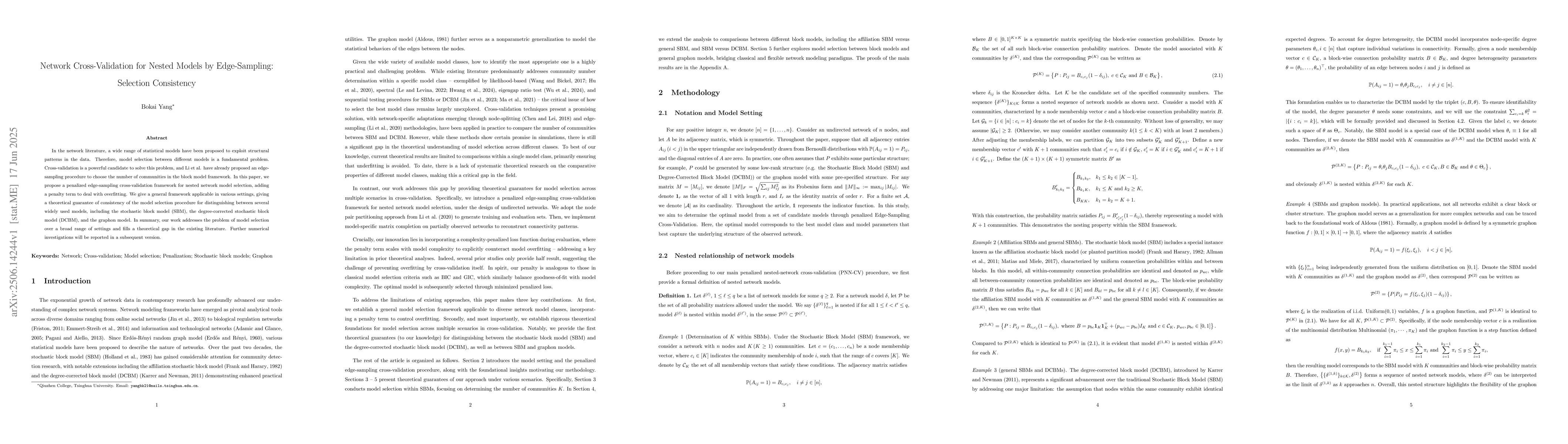 In the network literature, a wide range of statistical models have been proposed to exploit structural patterns in the data. Therefore, model selection between different models is a fundamental problem. Cross-validation is a powerful candidate to solve this problem, and Li et al. have already proposed an edge-sampling procedure to choose the number of communities in the block model framework. In this paper, we propose a penalized edge-sampling cross-validation framework for nested network model selection, adding a penalty term to deal with overfitting. We give a general framework applicable in various settings, giving a theoretical guarantee of consistency of the model selection procedure for distinguishing between several widely used models, including the stochastic block model (SBM), the degree-corrected stochastic block model (DCBM), and the graphon model. In summary, our work addresses the problem of model selection over a broad range of settings and fills a theoretical gap in the existing literature. Further numerical investigations will be reported in a subsequent version.