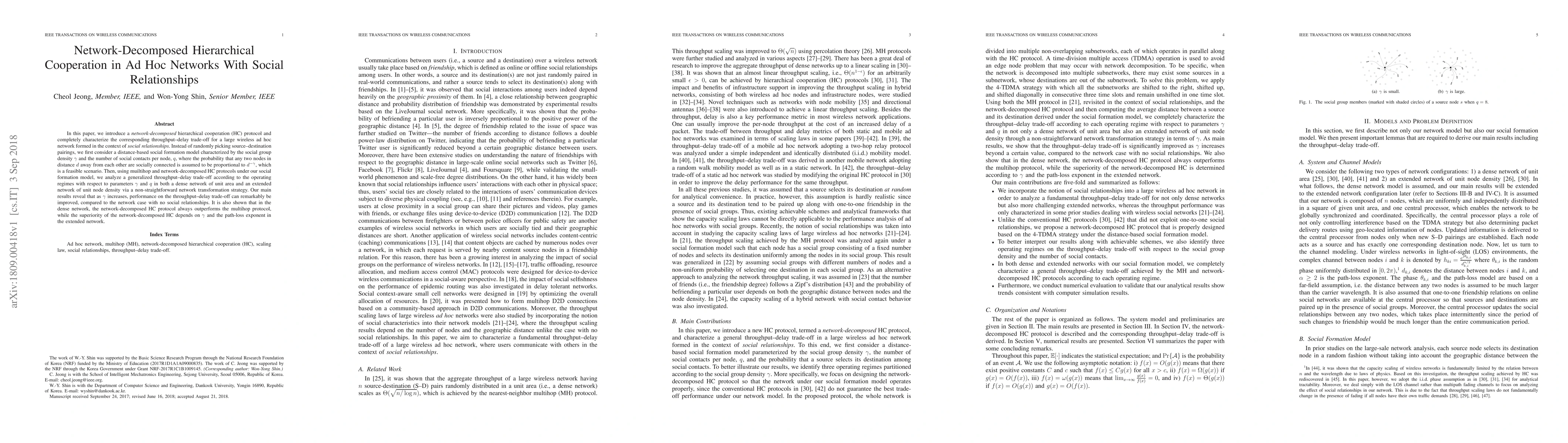This paper proposes a network-decomposed hierarchical cooperation protocol for ad hoc networks influenced by social relationships, analyzing its throughput-delay trade-off. The study finds that increased social group density significantly enhances performance compared to networks without social ties, with the hierarchical protocol generally outperforming multihop methods in dense networks.