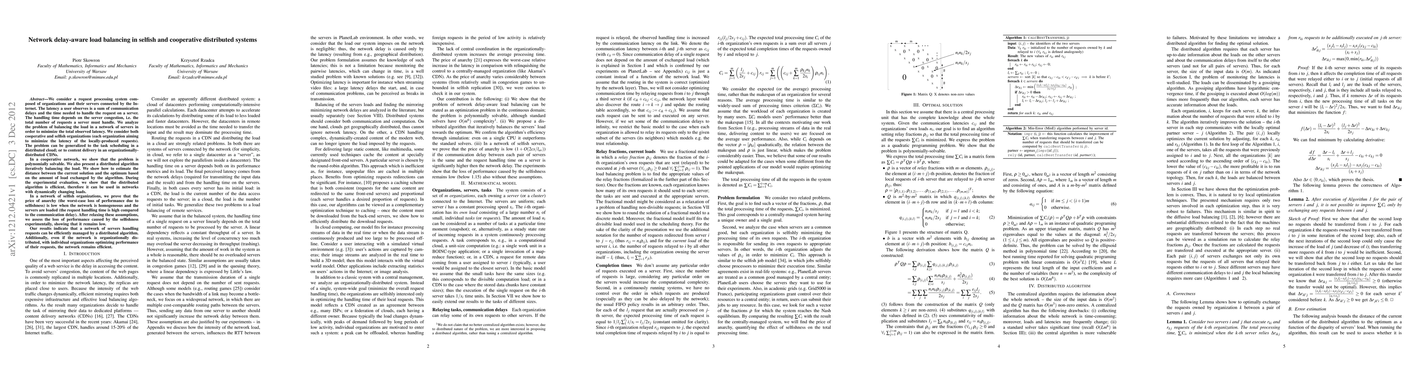 We consider a request processing system composed of organizations and their servers connected by the Internet. The latency a user observes is a sum of communication delays and the time needed to handle the request on a server. The handling time depends on the server congestion, i.e. the total number of requests a server must handle. We analyze the problem of balancing the load in a network of servers in order to minimize the total observed latency. We consider both cooperative and selfish organizations (each organization aiming to minimize the latency of the locally-produced requests). The problem can be generalized to the task scheduling in a distributed cloud; or to content delivery in an organizationally-distributed CDNs. In a cooperative network, we show that the problem is polynomially solvable. We also present a distributed algorithm iteratively balancing the load. We show how to estimate the distance between the current solution and the optimum based on the amount of load exchanged by the algorithm. During the experimental evaluation, we show that the distributed algorithm is efficient, therefore it can be used in networks with dynamically changing loads. In a network of selfish organizations, we prove that the price of anarchy (the worst-case loss of performance due to selfishness) is low when the network is homogeneous and the servers are loaded (the request handling time is high compared to the communication delay). After relaxing these assumptions, we assess the loss of performance caused by the selfishness experimentally, showing that it remains low. Our results indicate that a network of servers handling requests can be efficiently managed by a distributed algorithm. Additionally, even if the network is organizationally distributed, with individual organizations optimizing performance of their requests, the network remains efficient.
