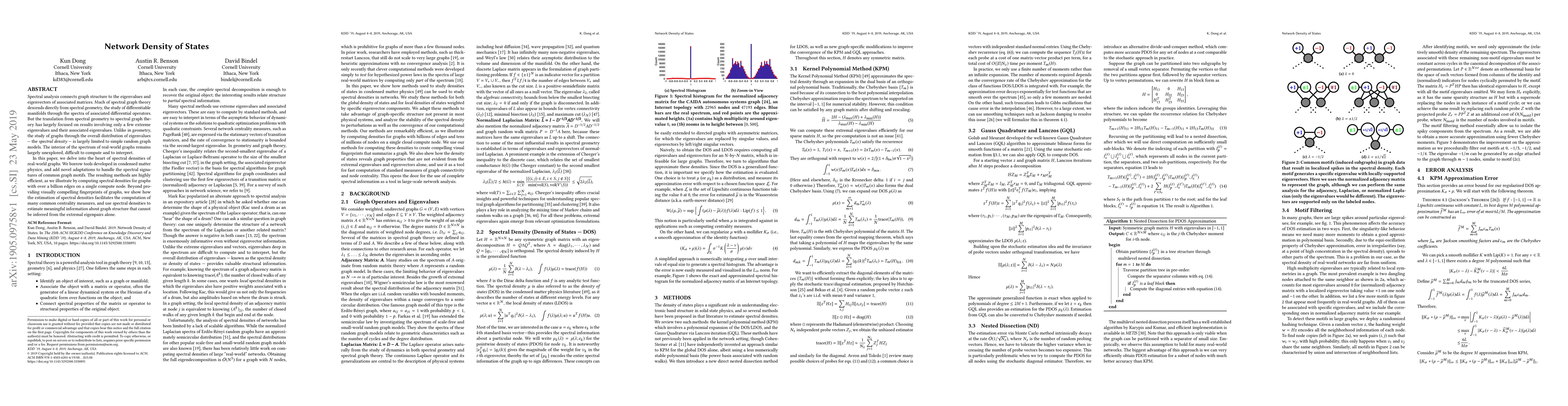Spectral analysis connects graph structure to the eigenvalues and eigenvectors of associated matrices. Much of spectral graph theory descends directly from spectral geometry, the study of differentiable manifolds through the spectra of associated differential operators. But the translation from spectral geometry to spectral graph theory has largely focused on results involving only a few extreme eigenvalues and their associated eigenvalues. Unlike in geometry, the study of graphs through the overall distribution of eigenvalues - the spectral density - is largely limited to simple random graph models. The interior of the spectrum of real-world graphs remains largely unexplored, difficult to compute and to interpret. In this paper, we delve into the heart of spectral densities of real-world graphs. We borrow tools developed in condensed matter physics, and add novel adaptations to handle the spectral signatures of common graph motifs. The resulting methods are highly efficient, as we illustrate by computing spectral densities for graphs with over a billion edges on a single compute node. Beyond providing visually compelling fingerprints of graphs, we show how the estimation of spectral densities facilitates the computation of many common centrality measures, and use spectral densities to estimate meaningful information about graph structure that cannot be inferred from the extremal eigenpairs alone.