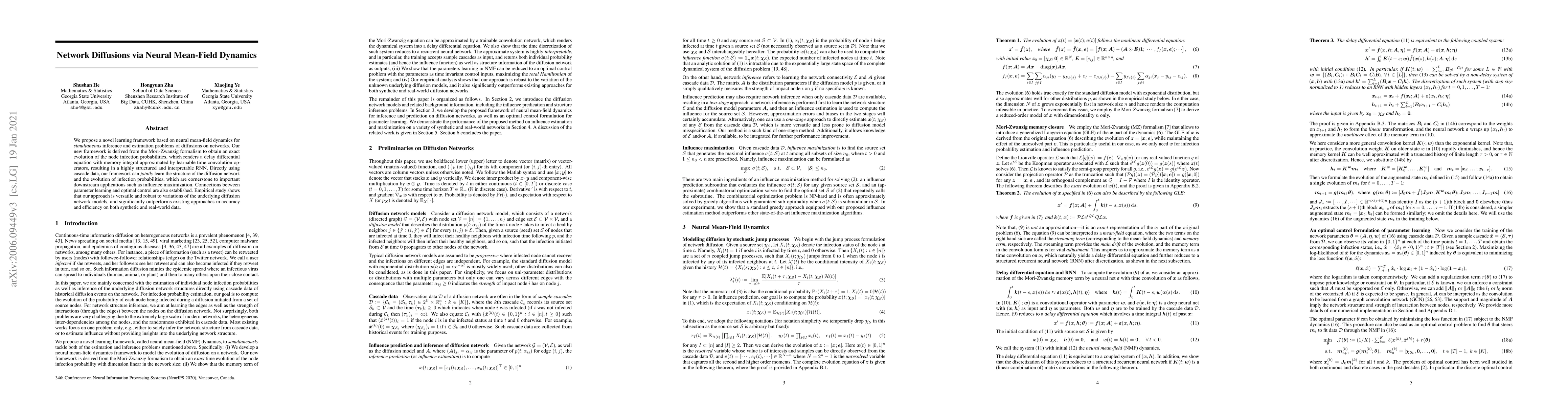 A new framework using neural mean-field dynamics improves accuracy and efficiency in modeling network diffusions, learning structure and infection probabilities with robustness to variations.