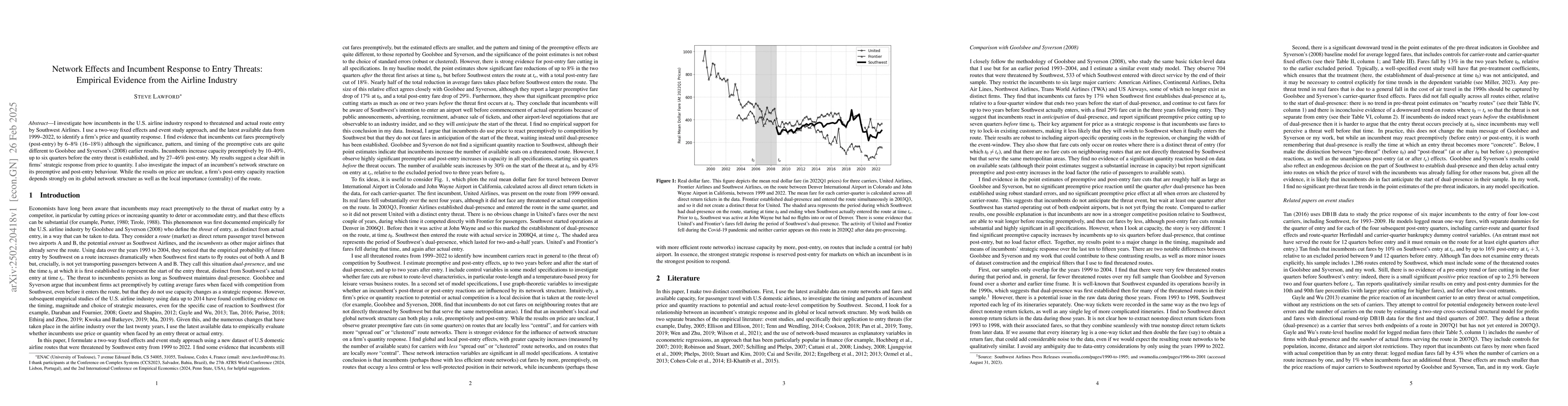 I investigate how incumbents in the U.S. airline industry respond to threatened and actual route entry by Southwest Airlines. I use a two-way fixed effects and event study approach, and the latest available data from 1999-2022, to identify a firm's price and quantity response. I find evidence that incumbents cut fares preemptively (post-entry) by 6-8% (16-18%) although the significance, pattern, and timing of the preemptive cuts are quite different to Goolsbee and Syverson's (2008) earlier results. Incumbents increase capacity preemptively by 10-40%, up to six quarters before the entry threat is established, and by 27-46% post-entry. My results suggest a clear shift in firms' strategic response from price to quantity. I also investigate the impact of an incumbent's network structure on its preemptive and post-entry behaviour. While the results on price are unclear, a firm's post-entry capacity reaction depends strongly on its global network structure as well as the local importance (centrality) of the route.