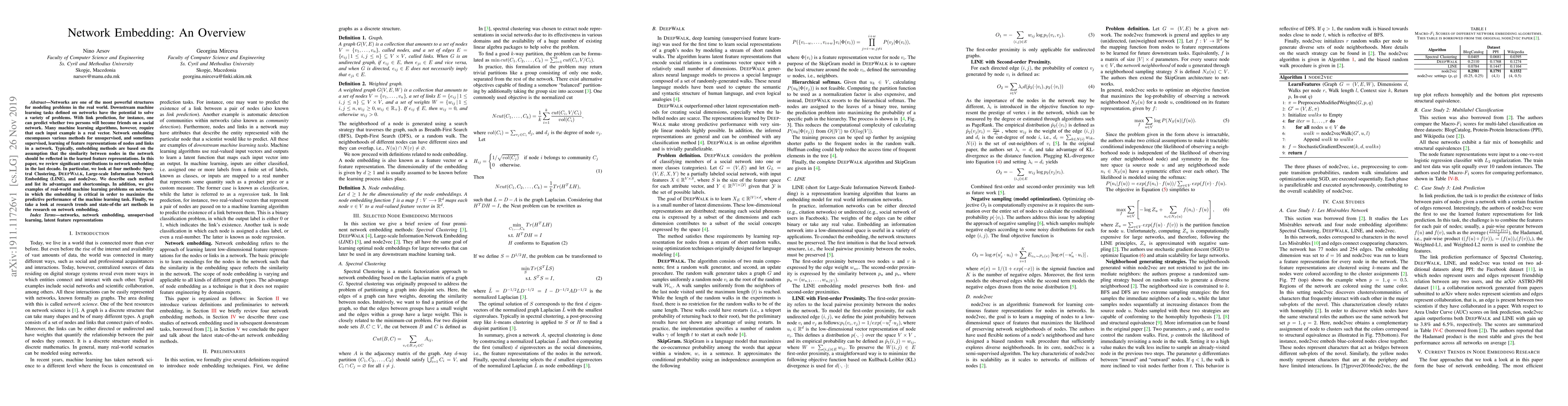 The paper highlights four key methods (Spectral Clustering, DeepWalk, LINE, and node2vec) and their applications in real-world machine learning problems on networks.