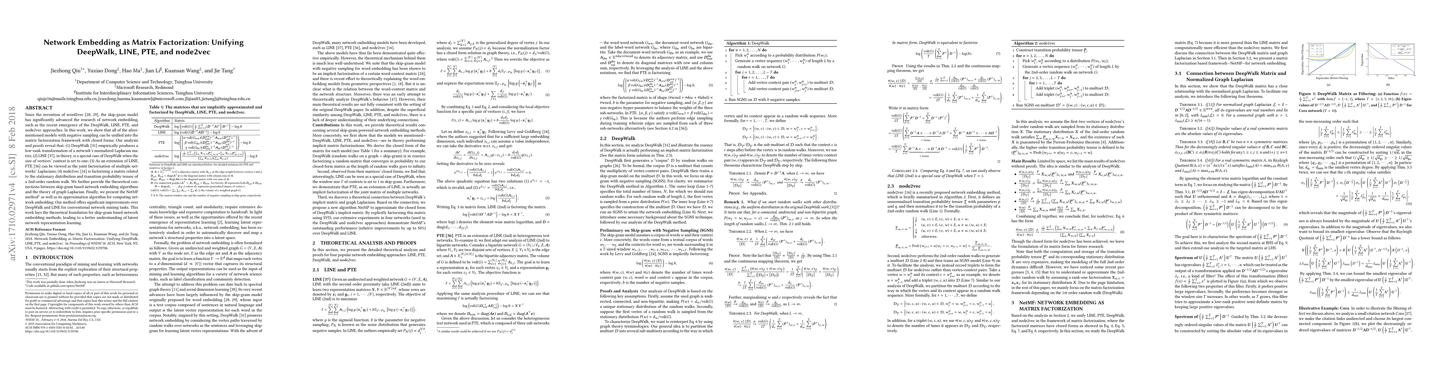 This paper unifies several network embedding methods—DeepWalk, LINE, PTE, and node2vec—under the matrix factorization framework, revealing their theoretical connections to graph Laplacians. It provides a comprehensive analysis showing how these methods can be viewed as different forms of matrix factorizations, leading to improved network mining performance.