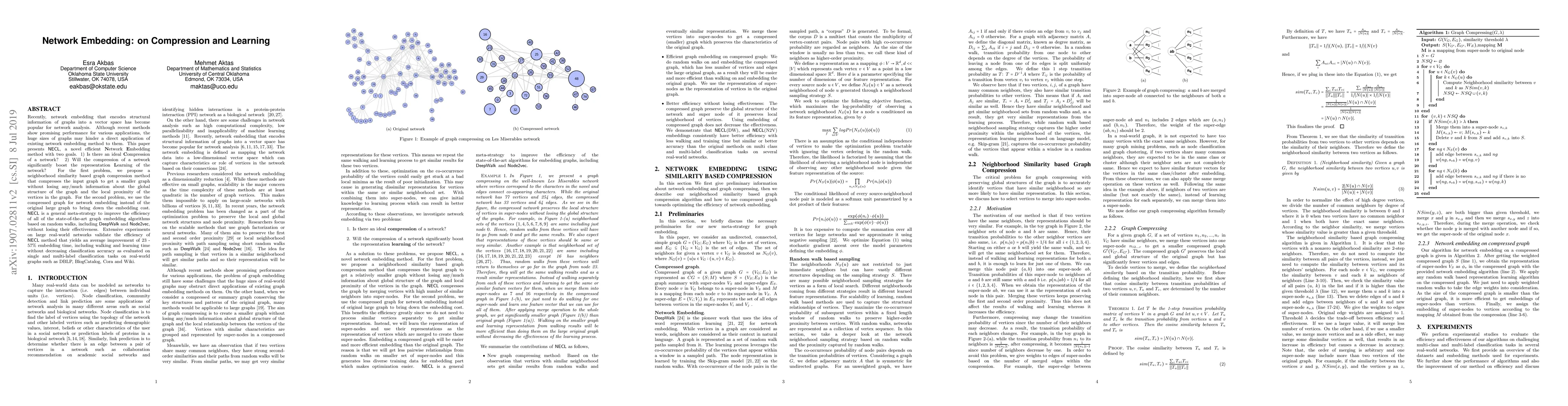 Recently, network embedding that encodes structural information of graphs into a vector space has become popular for network analysis. Although recent methods show promising performance for various applications, the huge sizes of graphs may hinder a direct application of existing network embedding method to them. This paper presents NECL, a novel efficient Network Embedding method with two goals. 1) Is there an ideal Compression of a network? 2) Will the compression of a network significantly boost the representation Learning of the network? For the first problem, we propose a neighborhood similarity based graph compression method that compresses the input graph to get a smaller graph without losing any/much information about the global structure of the graph and the local proximity of the vertices in the graph. For the second problem, we use the compressed graph for network embedding instead of the original large graph to bring down the embedding cost. NECL is a general meta-strategy to improve the efficiency of all of the state-of-the-art graph embedding algorithms based on random walks, including DeepWalk and Node2vec, without losing their effectiveness. Extensive experiments on large real-world networks validate the efficiency of NECL method that yields an average improvement of 23 - 57% embedding time, including walking and learning time without decreasing classification accuracy as evaluated on single and multi-label classification tasks on real-world graphs such as DBLP, BlogCatalog, Cora and Wiki.