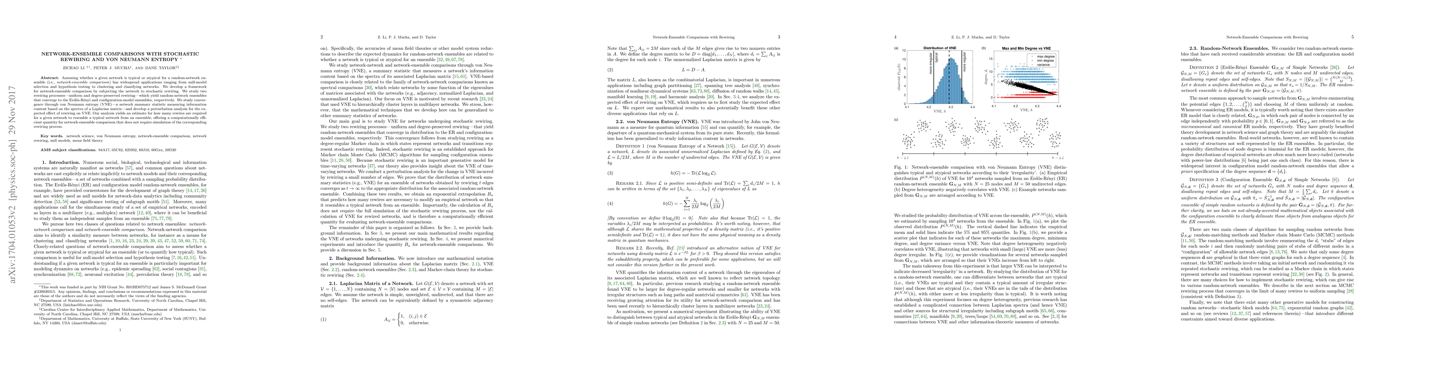 Assessing whether a given network is typical or atypical for a random-network ensemble (i.e., network-ensemble comparison) has widespread applications ranging from null-model selection and hypothesis testing to clustering and classifying networks. We develop a framework for network-ensemble comparison by subjecting the network to stochastic rewiring. We study two rewiring processes, uniform and degree-preserved rewiring, which yield random-network ensembles that converge to the Erdos-Renyi and configuration-model ensembles, respectively. We study convergence through von Neumann entropy (VNE), a network summary statistic measuring information content based on the spectra of a Laplacian matrix, and develop a perturbation analysis for the expected effect of rewiring on VNE. Our analysis yields an estimate for how many rewires are required for a given network to resemble a typical network from an ensemble, offering a computationally efficient quantity for network-ensemble comparison that does not require simulation of the corresponding rewiring process.