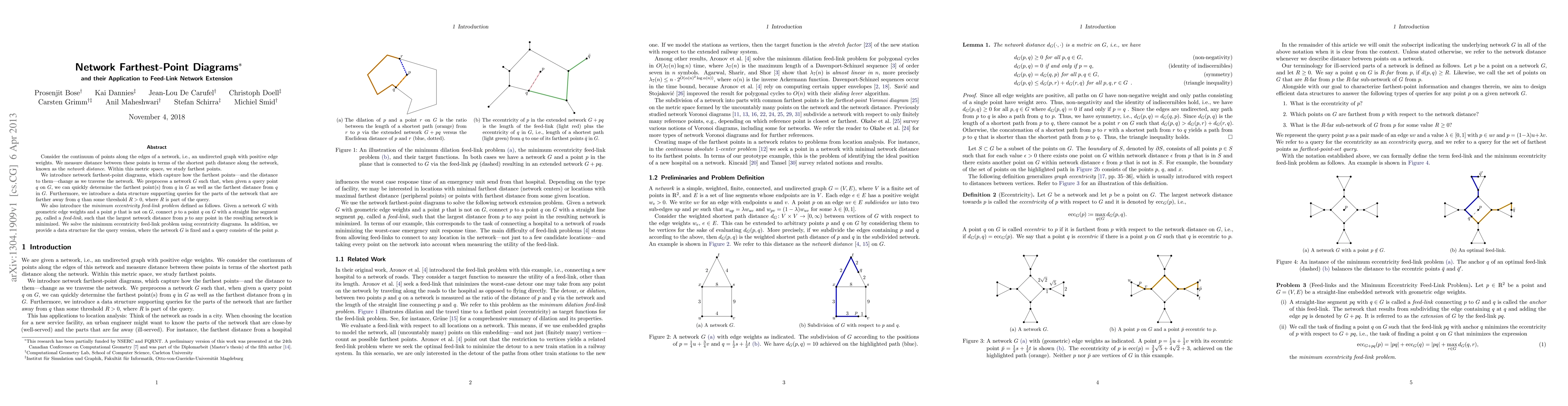 This paper introduces network farthest-point diagrams to capture changes in farthest points and distances within a network metric space. It presents a preprocessing method to quickly determine farthest points and distances from a query point, along with a data structure for threshold queries. Additionally, it addresses the minimum eccentricity feed-link problem and provides a solution using eccentricity diagrams and a data structure for querying.