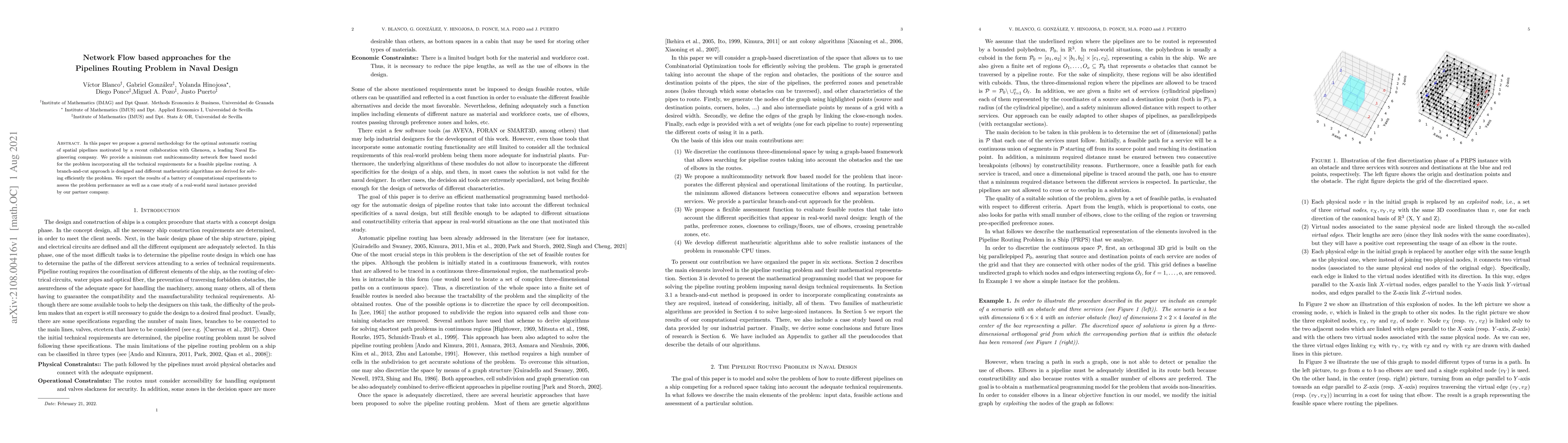 In this paper we propose a general methodology for the optimal automatic routing of spatial pipelines motivated by a recent collaboration with Ghenova, a leading Naval Engineering company. We provide a minimum cost multicommodity network flow based model for the problem incorporating all the technical requirements for a feasible pipeline routing. A branch-and-cut approach is designed and different matheuristic algorithms are derived for solving efficiently the problem. We report the results of a battery of computational experiments to assess the problem performance as well as a case study of a real-world naval instance provided by our partner company.