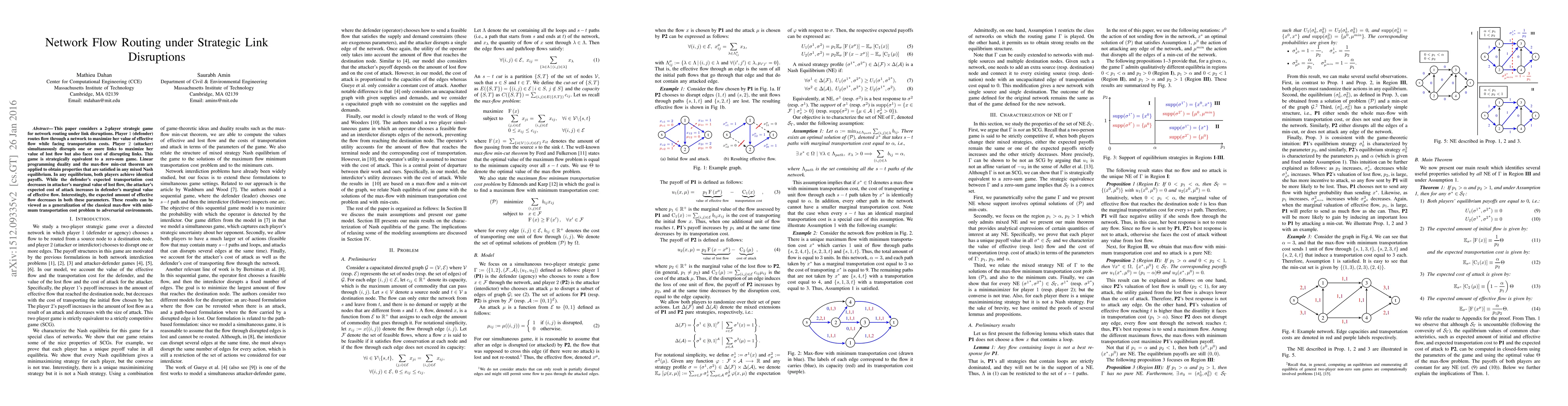 This paper considers a 2-player strategic game for network routing under link disruptions. Player 1 (defender) routes flow through a network to maximize her value of effective flow while facing transportation costs. Player 2 (attacker) simultaneously disrupts one or more links to maximize her value of lost flow but also faces cost of disrupting links. This game is strategically equivalent to a zero-sum game. Linear programming duality and the max-flow min-cut theorem are applied to obtain properties that are satisfied in any mixed Nash equilibrium. In any equilibrium, both players achieve identical payoffs. While the defender's expected transportation cost decreases in attacker's marginal value of lost flow, the attacker's expected cost of attack increases in defender's marginal value of effective flow. Interestingly, the expected amount of effective flow decreases in both these parameters. These results can be viewed as a generalization of the classical max-flow with minimum transportation cost problem to adversarial environments.