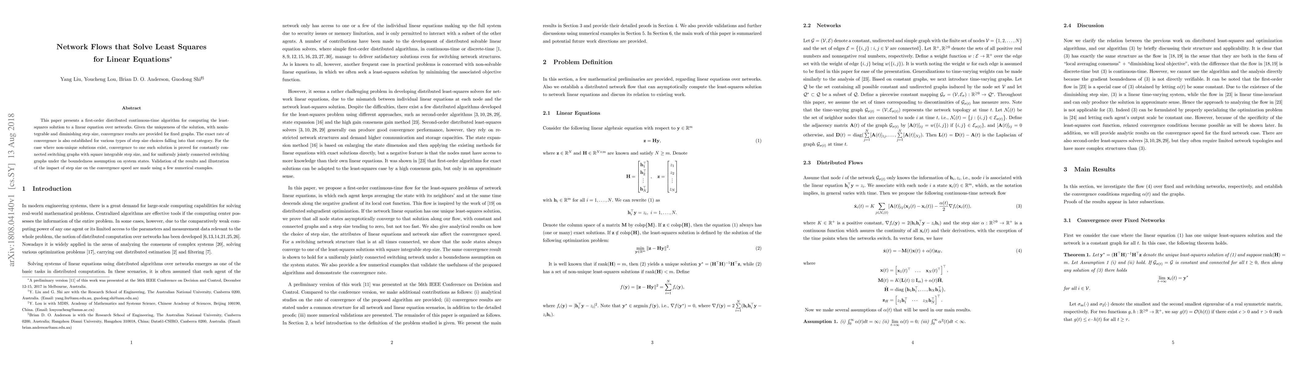 This paper presents a first-order {distributed continuous-time algorithm} for computing the least-squares solution to a linear equation over networks. Given the uniqueness of the solution, with nonintegrable and diminishing step size, convergence results are provided for fixed graphs. The exact rate of convergence is also established for various types of step size choices falling into that category. For the case where non-unique solutions exist, convergence to one such solution is proved for constantly connected switching graphs with square integrable step size, and for uniformly jointly connected switching graphs under the boundedness assumption on system states. Validation of the results and illustration of the impact of step size on the convergence speed are made using a few numerical examples.