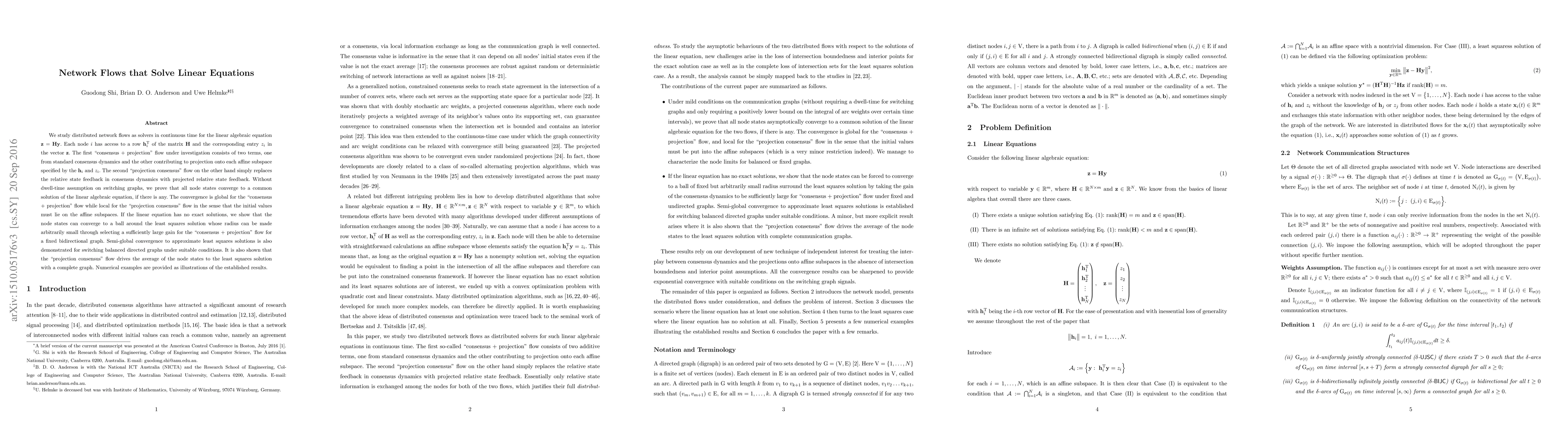 Researchers develop two network flow algorithms to solve linear equations in continuous time, with one approach converging globally and the other locally, and demonstrate convergence to approximate solutions in various scenarios.