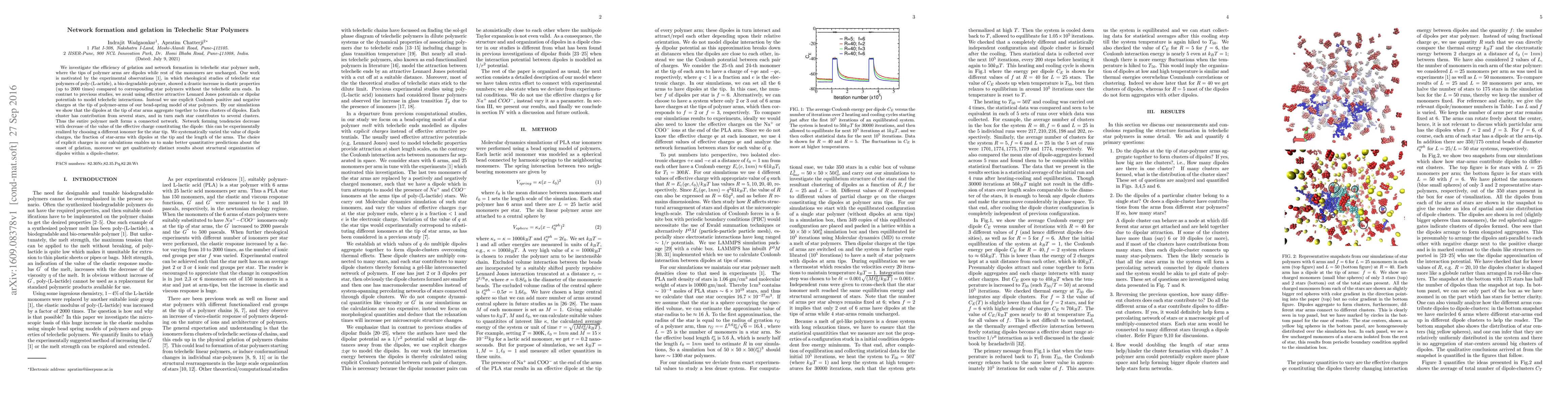 We investigate the efficiency of gelation and network formation in telechelic star polymer melt, where the tips of polymer arms are dipoles while rest of the monomers are uncharged. Our work is motivated by the experimental observations [A.Kulkarni et.al, Macromolecules, {\bf 48}, 6580 (2015)], in which rheological studies of telechelic star polymers of poly-(L-actide), a bio-degradable polymer, showed a drastic increase in elastic properties (up to $2000$ times) compared to corresponding star polymers without the telechelic arm ends. In contrast to previous studies, we avoid using effective attractive Lennard Jones potentials or dipolar potentials to model telechelic interactions. Instead we use explicit Coulomb positive and negative charges at the tip of polymer-arms of our bead-spring model of star polymers. By our simulations we show that the dipoles at the tip of star arms aggregate together to form clusters of dipoles. Each cluster has contribution from several stars, and in turn each star contributes to several clusters. Thus the entire polymer melt forms a connected network. Network forming tendencies decrease with decrease of the value of the effective charge constituting the dipole: this can be experimentally realized by choosing a different ionomer for the star tip. We systematically varied the value of dipole charges, the fraction of star-arms with dipoles at the tip and the length of the arms. The choice of explicit charges in our calculations enables us to make better quantitative predictions about the onset of gelation, moreover we get qualitatively distinct results about structural organization of dipoles within a dipole-cluster.