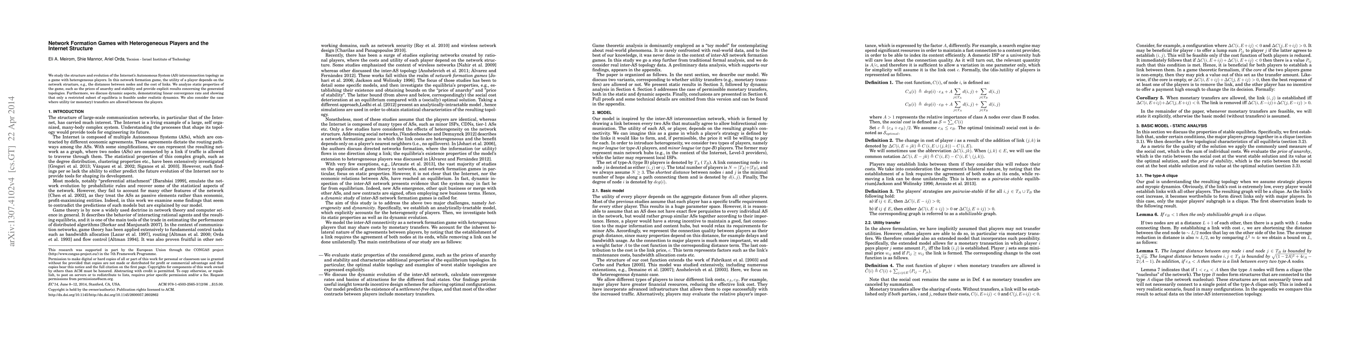 We study the structure and evolution of the Internet's Autonomous System (AS) interconnection topology as a game with heterogeneous players. In this network formation game, the utility of a player depends on the network structure, e.g., the distances between nodes and the cost of links. We analyze static properties of the game, such as the prices of anarchy and stability and provide explicit results concerning the generated topologies. Furthermore, we discuss dynamic aspects, demonstrating linear convergence rate and showing that only a restricted subset of equilibria is feasible under realistic dynamics. We also consider the case where utility (or monetary) transfers are allowed between the players.