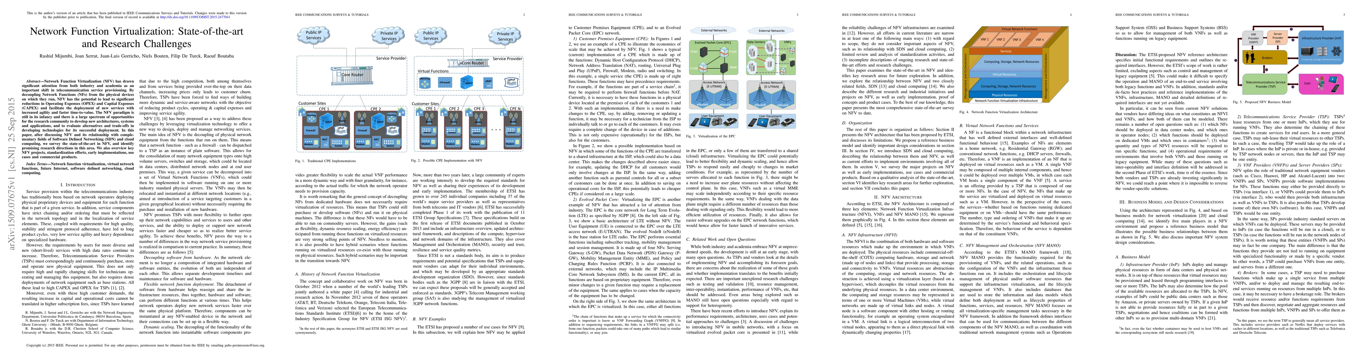 This paper surveys the state-of-the-art in Network Function Virtualization (NFV), highlighting its potential to reduce costs and improve service agility. It identifies research challenges and opportunities, discusses complementary fields, and reviews key projects, standardization efforts, and commercial implementations.