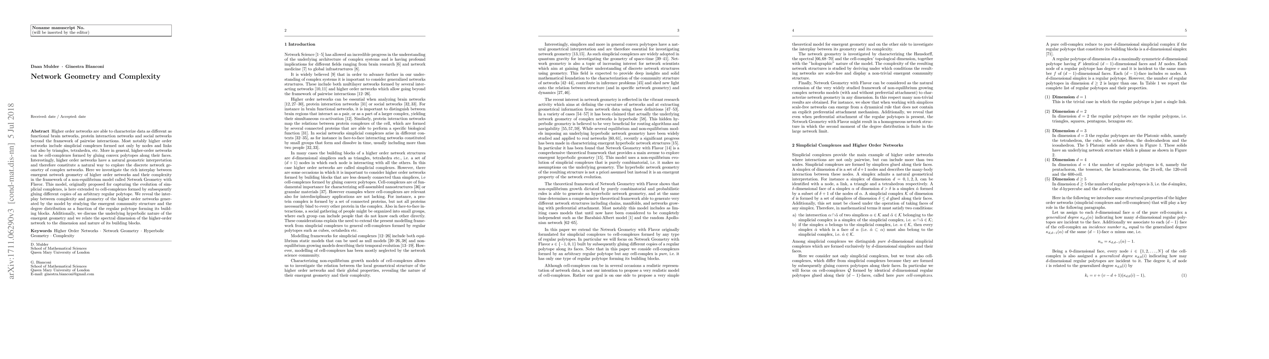 This paper explores higher order networks, which extend beyond pairwise interactions to include structures like triangles and tetrahedra, and investigates their emergent geometry and complexity using a non-equilibrium model called Network Geometry with Flavor. The study reveals the interplay between the network's geometry and complexity, highlighting the hyperbolic nature of the emergent geometry and linking the spectral dimension to the building blocks of the network.
