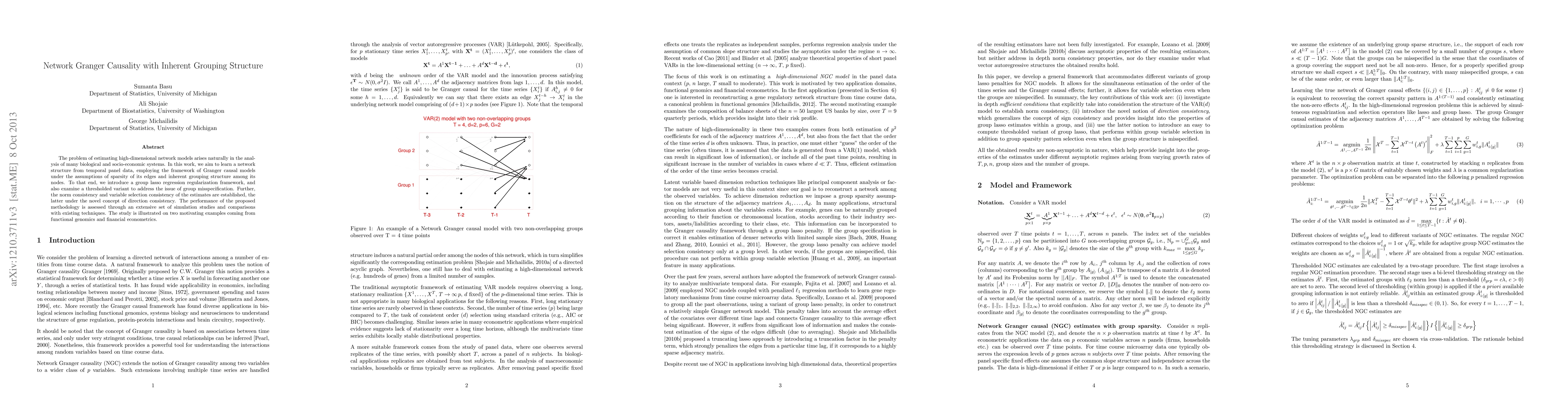 The problem of estimating high-dimensional network models arises naturally in the analysis of many physical, biological and socio-economic systems. Examples include stock price fluctuations in financial markets and gene regulatory networks representing effects of regulators (transcription factors) on regulated genes in genetics. We aim to learn the structure of the network over time employing the framework of Granger causal models under the assumptions of sparsity of its edges and inherent grouping structure among its nodes. We introduce a thresholded variant of the Group Lasso estimator for discovering Granger causal interactions among the nodes of the network. Asymptotic results on the consistency of the new estimation procedure are developed. The performance of the proposed methodology is assessed through an extensive set of simulation studies and comparisons with existing techniques.