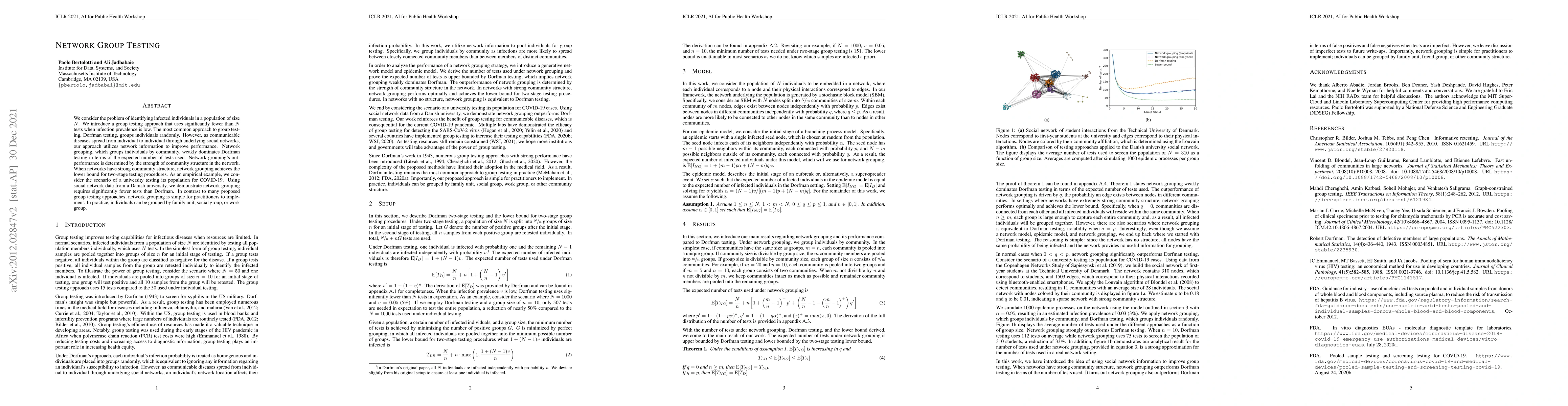 We consider the problem of identifying infected individuals in a population of size N. We introduce a group testing approach that uses significantly fewer than N tests when infection prevalence is low. The most common approach to group testing, Dorfman testing, groups individuals randomly. However, as communicable diseases spread from individual to individual through underlying social networks, our approach utilizes network information to improve performance. Network grouping, which groups individuals by community, weakly dominates Dorfman testing in terms of the expected number of tests used. Network grouping's outperformance is determined by the strength of community structure in the network. When networks have strong community structure, network grouping achieves the lower bound for two-stage testing procedures. As an empirical example, we consider the scenario of a university testing its population for COVID-19. Using social network data from a Danish university, we demonstrate network grouping requires significantly fewer tests than Dorfman. In contrast to many proposed group testing approaches, network grouping is simple for practitioners to implement. In practice, individuals can be grouped by family unit, social group, or work group.