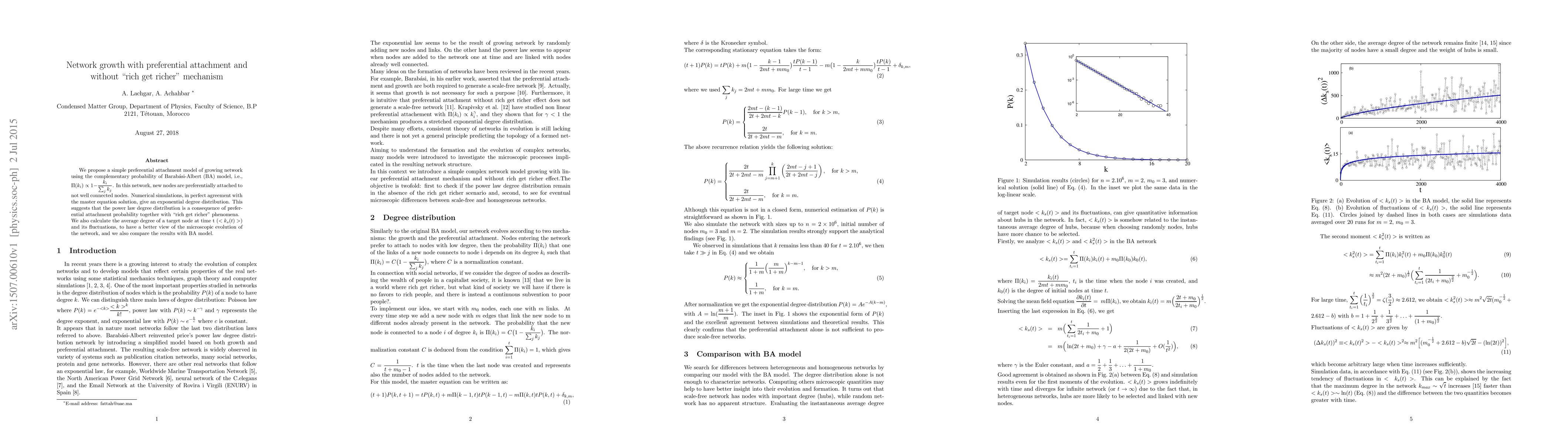 A network model with preferential attachment shows an exponential degree distribution without the 'rich get richer' mechanism, similar to the Barabasi-Albert model.