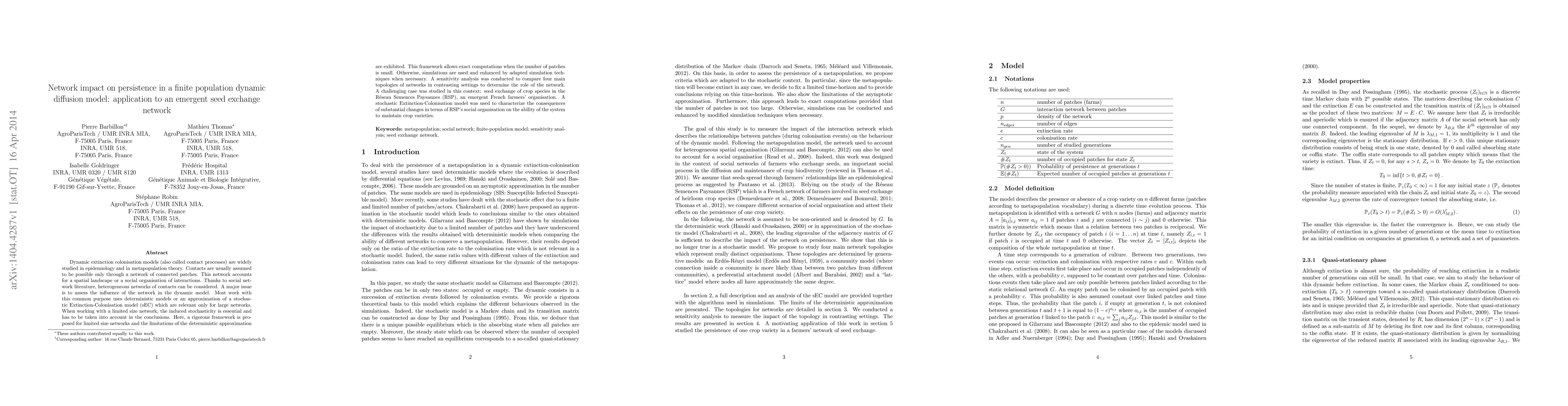 Dynamic extinction colonisation models (also called contact processes) are widely studied in epidemiology and in metapopulation theory. Contacts are usually assumed to be possible only through a network of connected patches. This network accounts for a spatial landscape or a social organisation of interactions. Thanks to social network literature, heterogeneous networks of contacts can be considered. A major issue is to assess the influence of the network in the dynamic model. Most work with this common purpose uses deterministic models or an approximation of a stochastic Extinction-Colonisation model (sEC) which are relevant only for large networks. When working with a limited size network, the induced stochasticity is essential and has to be taken into account in the conclusions. Here, a rigorous framework is proposed for limited size networks and the limitations of the deterministic approximation are exhibited. This framework allows exact computations when the number of patches is small. Otherwise, simulations are used and enhanced by adapted simulation techniques when necessary. A sensitivity analysis was conducted to compare four main topologies of networks in contrasting settings to determine the role of the network. A challenging case was studied in this context: seed exchange of crop species in the R\'eseau Semences Paysannes (RSP), an emergent French farmers' organisation. A stochastic Extinction-Colonisation model was used to characterize the consequences of substantial changes in terms of RSP's social organisation on the ability of the system to maintain crop varieties.
