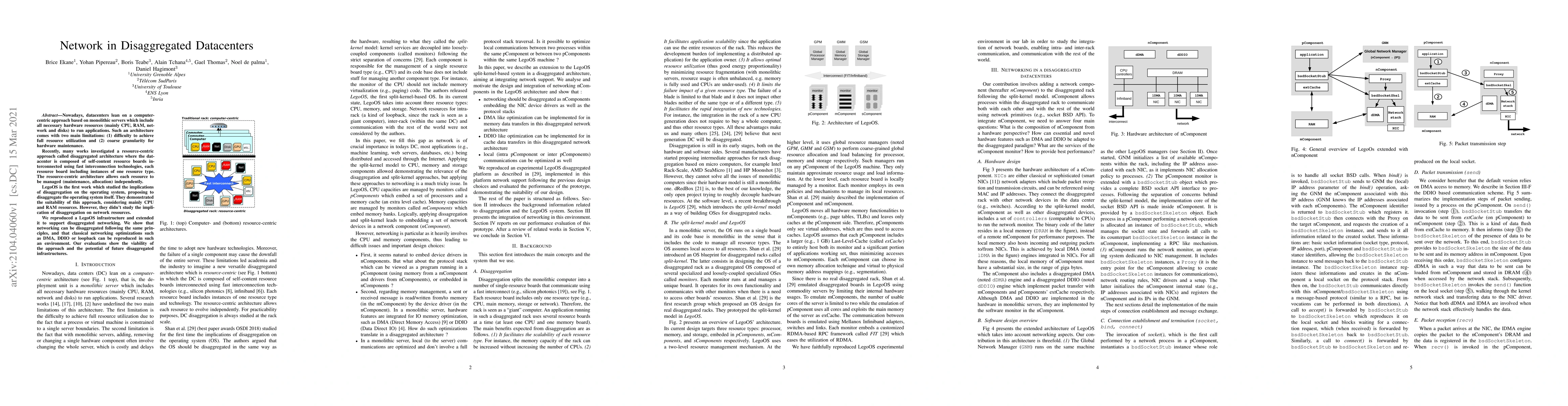 Nowadays, datacenters lean on a computer-centric approach based on monolithic servers which include all necessary hardware resources (mainly CPU, RAM, network and disks) to run applications. Such an architecture comes with two main limitations: (1) difficulty to achieve full resource utilization and (2) coarse granularity for hardware maintenance. Recently, many works investigated a resource-centric approach called disaggregated architecture where the datacenter is composed of self-content resource boards interconnected using fast interconnection technologies, each resource board including instances of one resource type. The resource-centric architecture allows each resource to be managed (maintenance, allocation) independently. LegoOS is the first work which studied the implications of disaggregation on the operating system, proposing to disaggregate the operating system itself. They demonstrated the suitability of this approach, considering mainly CPU and RAM resources. However, they didn't study the implication of disaggregation on network resources. We reproduced a LegoOS infrastructure and extended it to support disaggregated networking. We show that networking can be disaggregated following the same principles, and that classical networking optimizations such as DMA, DDIO or loopback can be reproduced in such an environment. Our evaluations show the viability of the approach and the potential of future disaggregated infrastructures.