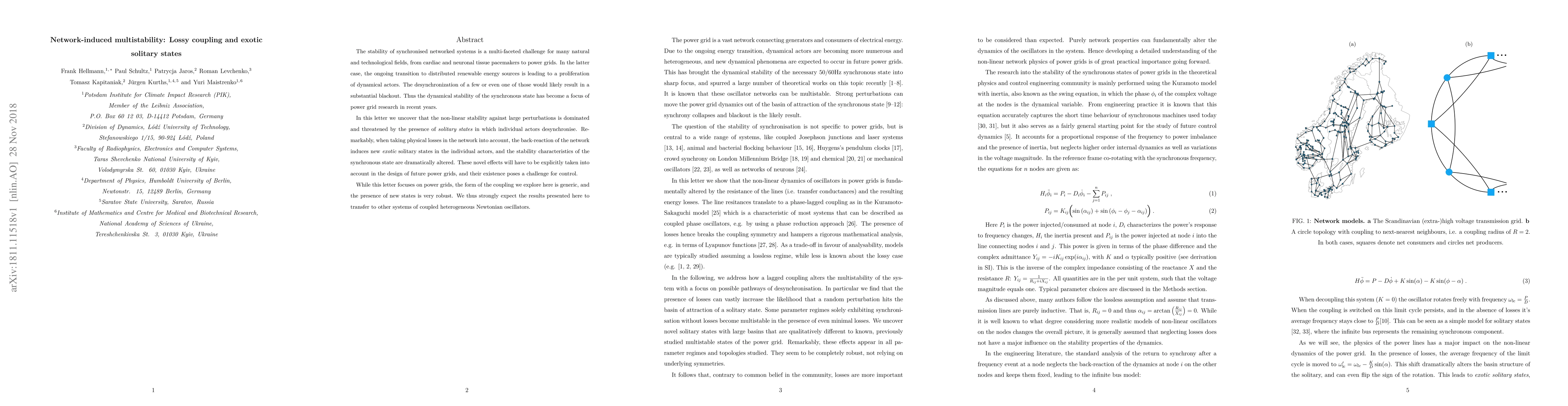 The stability of synchronised networked systems is a multi-faceted challenge for many natural and technological fields, from cardiac and neuronal tissue pacemakers to power grids. In the latter case, the ongoing transition to distributed renewable energy sources is leading to a proliferation of dynamical actors. The desynchronization of a few or even one of those would likely result in a substantial blackout. Thus the dynamical stability of the synchronous state has become a focus of power grid research in recent years. In this letter we uncover that the non-linear stability against large perturbations is dominated and threatened by the presence of \textit{solitary states} in which individual actors desynchronise. Remarkably, when taking physical losses in the network into account, the back-reaction of the network induces new {\it exotic} solitary states in the individual actors, and the stability characteristics of the synchronous state are dramatically altered. These novel effects will have to be explicitly taken into account in the design of future power grids, and their existence poses a challenge for control. While this letter focuses on power grids, the form of the coupling we explore here is generic, and the presence of new states is very robust. We thus strongly expect the results presented here to transfer to other systems of coupled heterogeneous Newtonian oscillators.