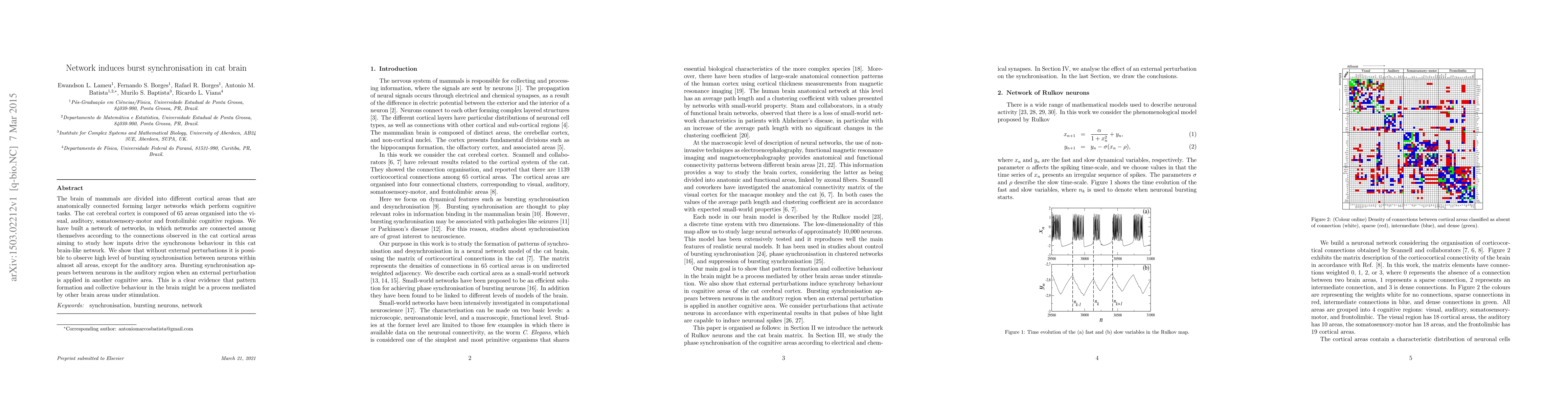 The brain of mammals are divided into different cortical areas that are anatomically connected forming larger networks which perform cognitive tasks. The cat cerebral cortex is composed of 65 areas organised into the visual, auditory, somatosensory-motor and frontolimbic cognitive regions. We have built a network of networks, in which networks are connected among themselves according to the connections observed in the cat cortical areas aiming to study how inputs drive the synchronous behaviour in this cat brain-like network. We show that without external perturbations it is possible to observe high level of bursting synchronisation between neurons within almost all areas, except for the auditory area. Bursting synchronisation appears between neurons in the auditory region when an external perturbation is applied in another cognitive area. This is a clear evidence that pattern formation and collective behaviour in the brain might be a process mediated by other brain areas under stimulation.