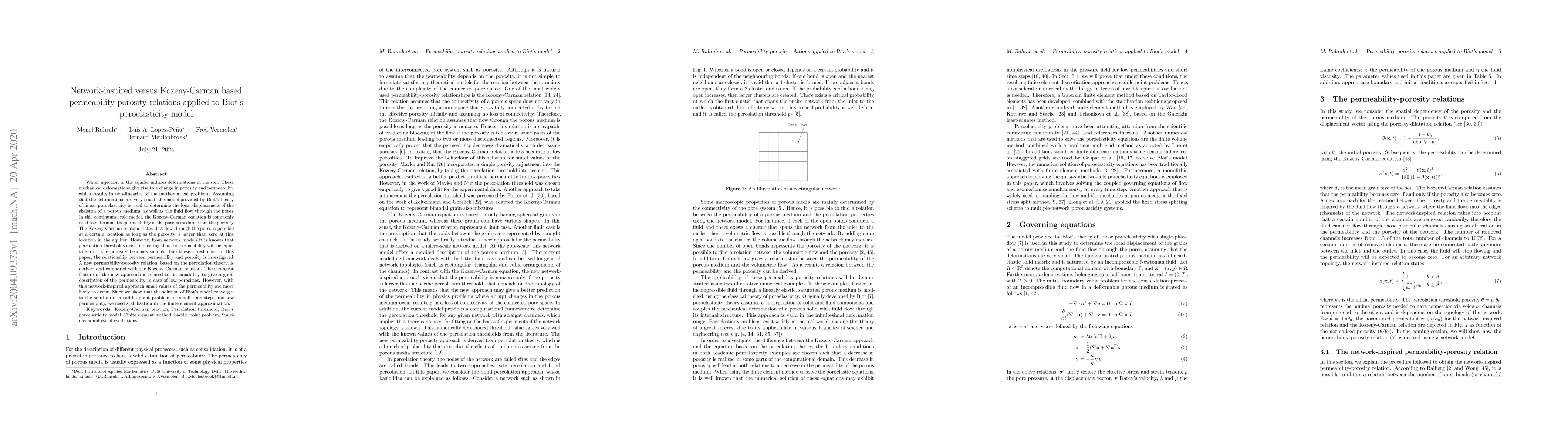 Water injection in the aquifer induces deformations in the soil. These mechanical deformations give rise to a change in porosity and permeability, which results in non-linearity of the mathematical problem. Assuming that the deformations are very small, the model provided by Biot's theory of linear poroelasticity is used to determine the local displacement of the skeleton of a porous medium, as well as the fluid flow through the pores. In this continuum scale model, the Kozeny-Carman equation is commonly used to determine the permeability of the porous medium from the porosity. The Kozeny-Carman relation states that flow through the pores is possible at a certain location as long as the porosity is larger than zero at this location in the aquifer. However, from network models it is known that percolation thresholds exist, indicating that the permeability will be equal to zero if the porosity becomes smaller than these thresholds. In this paper, the relationship between permeability and porosity is investigated. A new permeability-porosity relation, based on the percolation theory, is derived and compared with the Kozeny-Carman relation. The strongest feature of the new approach is related to its capability to give a good description of the permeability in case of low porosities. However, with this network-inspired approach small values of the permeability are more likely to occur. Since we show that the solution of Biot's model converges to the solution of a saddle point problem for small time steps and low permeability, we need stabilisation in the finite element approximation.