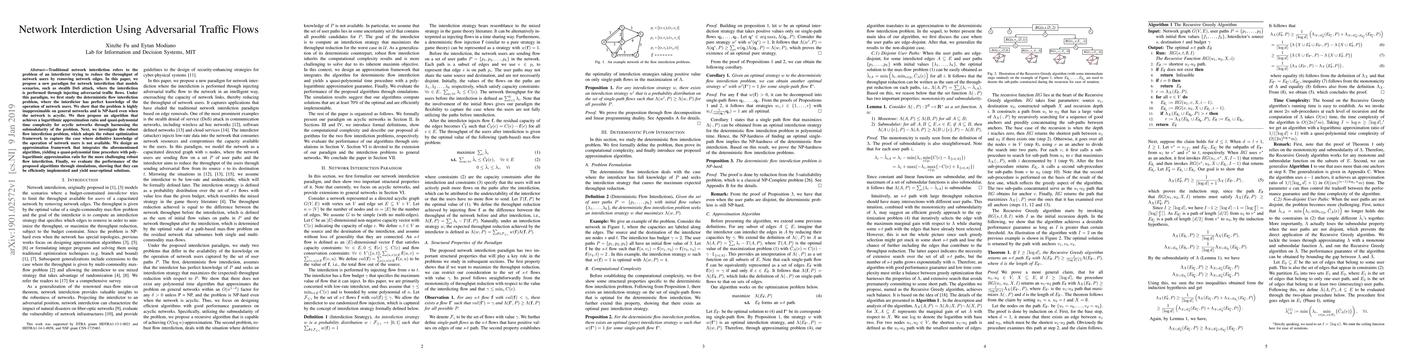 This paper introduces a novel approach to network interdiction using adversarial traffic flows, focusing on scenarios like stealth DoS attacks. It proposes algorithms to address both deterministic and robust flow interdiction problems, achieving logarithmic approximations and quasi-polynomial time complexity, validated through efficient simulations yielding near-optimal solutions.