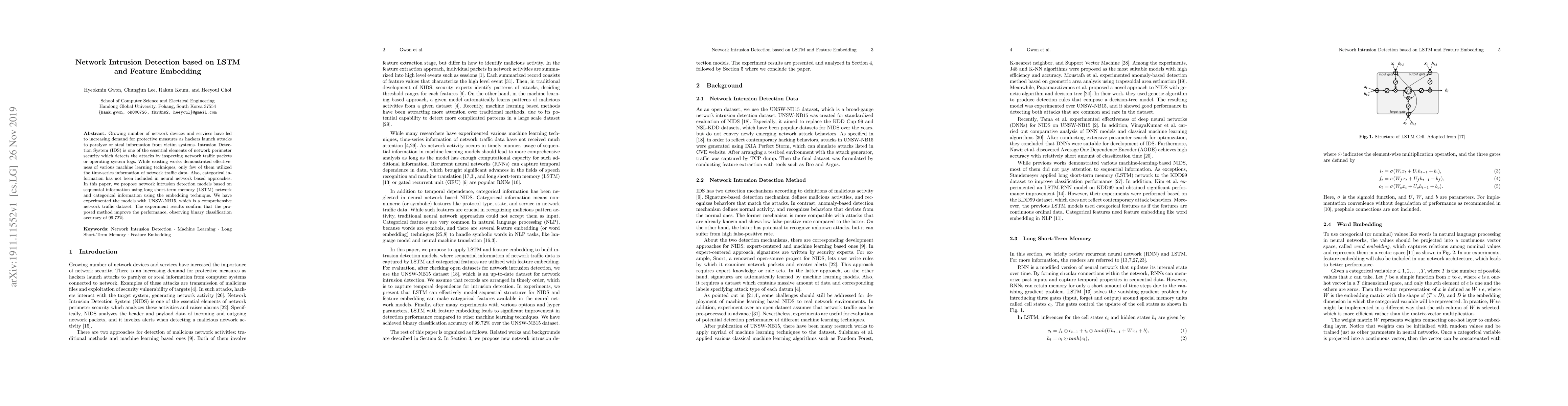 Growing number of network devices and services have led to increasing demand for protective measures as hackers launch attacks to paralyze or steal information from victim systems. Intrusion Detection System (IDS) is one of the essential elements of network perimeter security which detects the attacks by inspecting network traffic packets or operating system logs. While existing works demonstrated effectiveness of various machine learning techniques, only few of them utilized the time-series information of network traffic data. Also, categorical information has not been included in neural network based approaches. In this paper, we propose network intrusion detection models based on sequential information using long short-term memory (LSTM) network and categorical information using the embedding technique. We have experimented the models with UNSW-NB15, which is a comprehensive network traffic dataset. The experiment results confirm that the proposed method improve the performance, observing binary classification accuracy of 99.72\%.