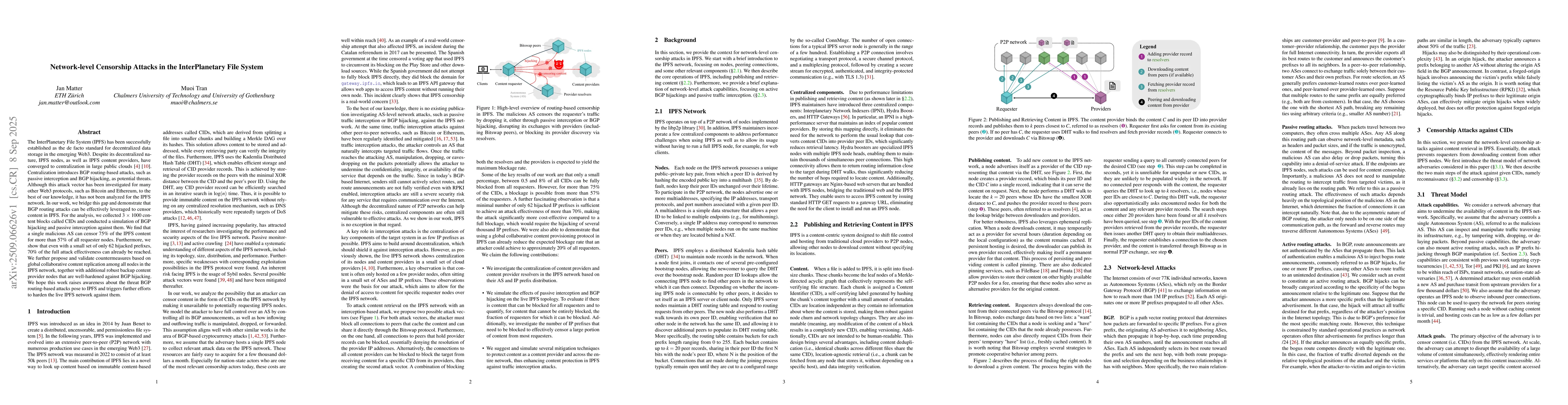 The InterPlanetary File System (IPFS) has been successfully established as the de facto standard for decentralized data storage in the emerging Web3. Despite its decentralized nature, IPFS nodes, as well as IPFS content providers, have converged to centralization in large public clouds. Centralization introduces BGP routing-based attacks, such as passive interception and BGP hijacking, as potential threats. Although this attack vector has been investigated for many other Web3 protocols, such as Bitcoin and Ethereum, to the best of our knowledge, it has not been analyzed for the IPFS network. In our work, we bridge this gap and demonstrate that BGP routing attacks can be effectively leveraged to censor content in IPFS. For the analysis, we collected 3,000 content blocks called CIDs and conducted a simulation of BGP hijacking and passive interception against them. We find that a single malicious AS can censor 75% of the IPFS content for more than 57% of all requester nodes. Furthermore, we show that even with a small set of only 62 hijacked prefixes, 70% of the full attack effectiveness can already be reached. We further propose and validate countermeasures based on global collaborative content replication among all nodes in the IPFS network, together with additional robust backup content provider nodes that are well-hardened against BGP hijacking. We hope this work raises awareness about the threat BGP routing-based attacks pose to IPFS and triggers further efforts to harden the live IPFS network against them.