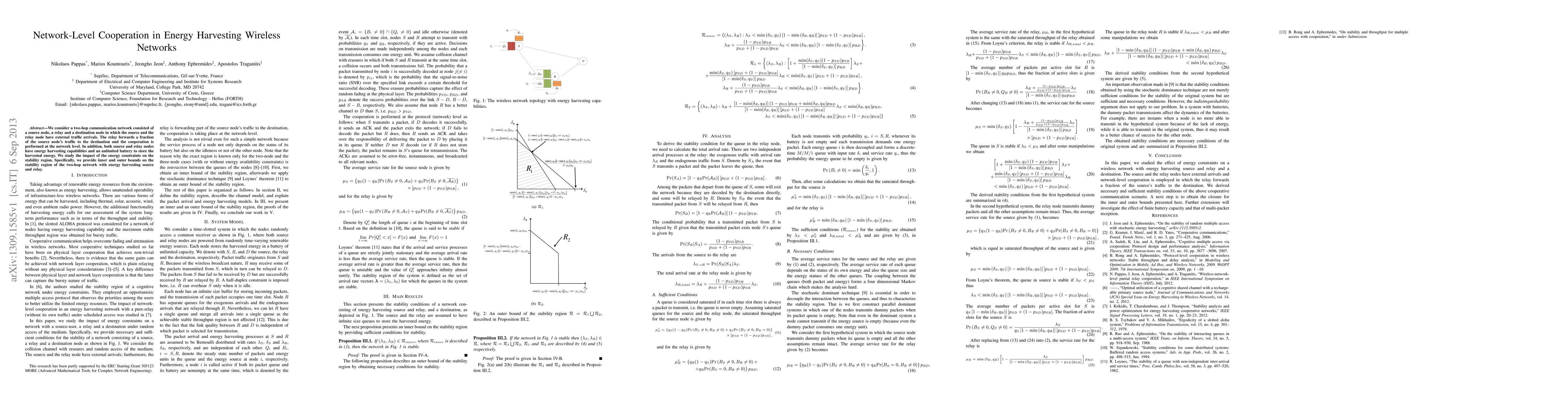 We consider a two-hop communication network consisted of a source node, a relay and a destination node in which the source and the relay node have external traffic arrivals. The relay forwards a fraction of the source node's traffic to the destination and the cooperation is performed at the network level. In addition, both source and relay nodes have energy harvesting capabilities and an unlimited battery to store the harvested energy. We study the impact of the energy constraints on the stability region. Specifically, we provide inner and outer bounds on the stability region of the two-hop network with energy harvesting source and relay.