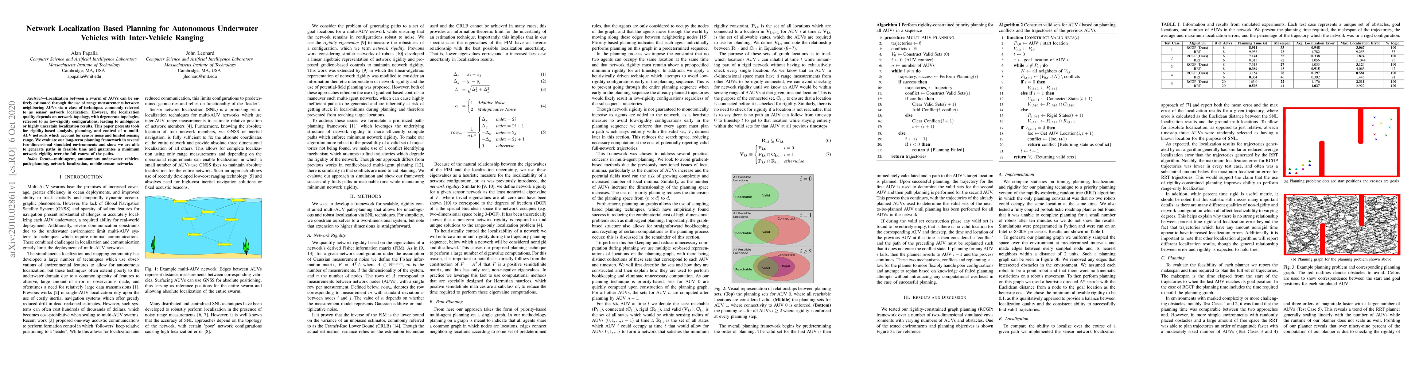 Localization between a swarm of AUVs can be entirely estimated through the use of range measurements between neighboring AUVs via a class of techniques commonly referred to as sensor network localization. However, the localization quality depends on network topology, with degenerate topologies, referred to as low-rigidity configurations, leading to ambiguous or highly uncertain localization results. This paper presents tools for rigidity-based analysis, planning, and control of a multi-AUV network which account for sensor noise and limited sensing range. We evaluate our long-term planning framework in several two-dimensional simulated environments and show we are able to generate paths in feasible time and guarantee a minimum network rigidity over the full course of the paths.