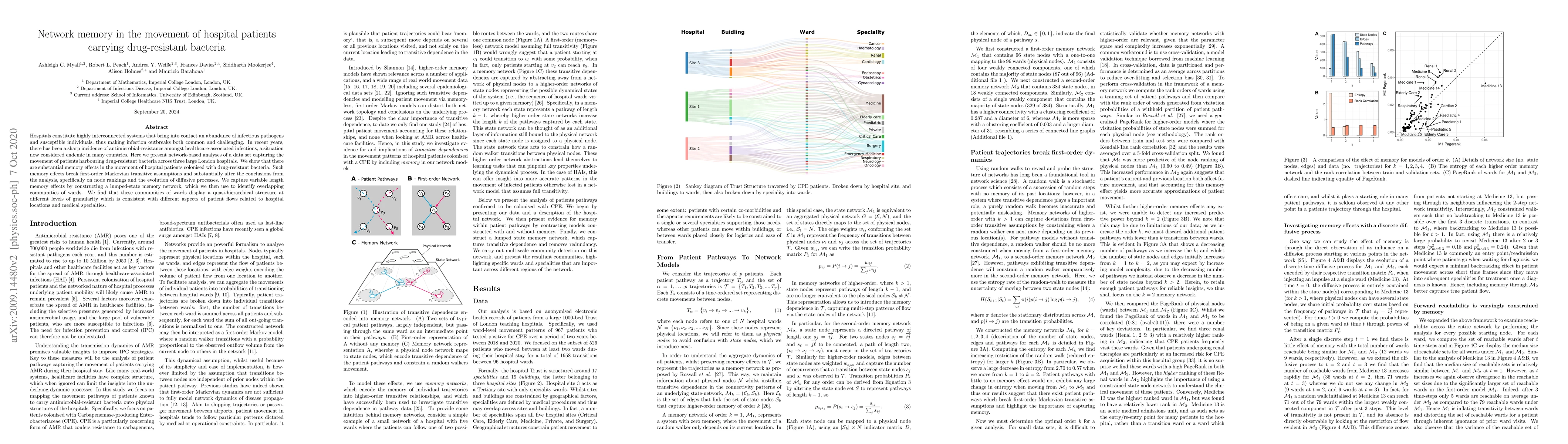 Hospitals constitute highly interconnected systems that bring into contact an abundance of infectious pathogens and susceptible individuals, thus making infection outbreaks both common and challenging. In recent years, there has been a sharp incidence of antimicrobial-resistance amongst healthcare-associated infections, a situation now considered endemic in many countries. Here we present network-based analyses of a data set capturing the movement of patients harbouring drug-resistant bacteria across three large London hospitals. We show that there are substantial memory effects in the movement of hospital patients colonised with drug-resistant bacteria. Such memory effects break first-order Markovian transitive assumptions and substantially alter the conclusions from the analysis, specifically on node rankings and the evolution of diffusive processes. We capture variable length memory effects by constructing a lumped-state memory network, which we then use to identify overlapping communities of wards. We find that these communities of wards display a quasi-hierarchical structure at different levels of granularity which is consistent with different aspects of patient flows related to hospital locations and medical specialties.