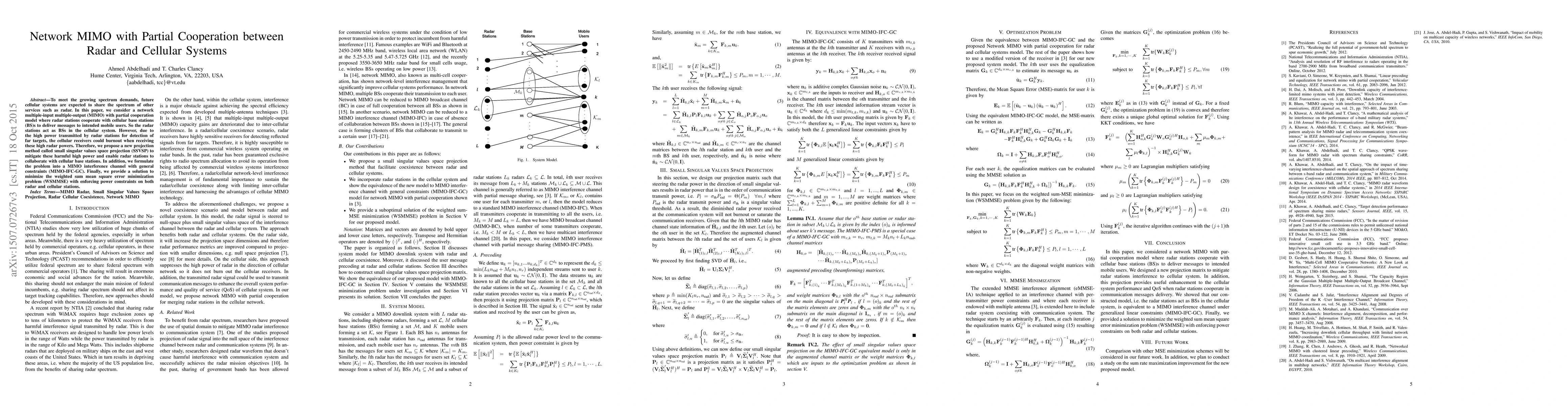 This paper explores a network MIMO model where radar and cellular systems partially cooperate to deliver messages. To address the issue of high radar power potentially causing cellular receiver burnout, a new projection method called SSVSP is proposed to mitigate interference. The paper formulates the problem as a MIMO interference channel and provides a solution for minimizing the weighted sum mean square error while enforcing power constraints.