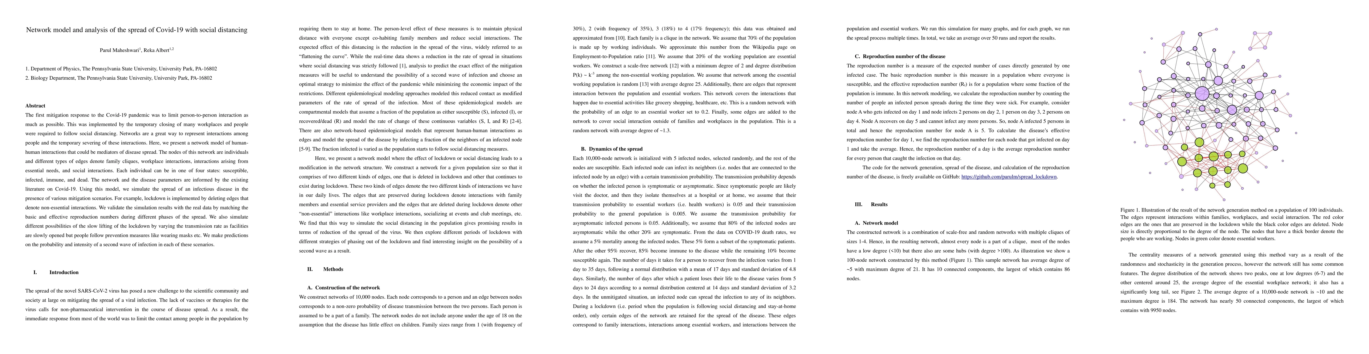 A network model simulates the spread of Covid-19 with social distancing measures, predicting the probability and intensity of a second wave based on various lockdown scenarios.