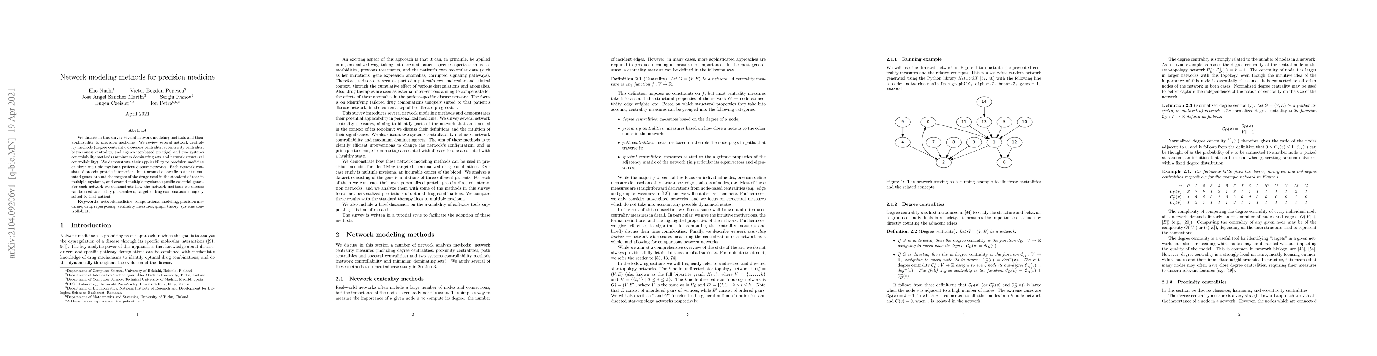 This paper surveys network modeling methods, including centrality and controllability techniques, and applies them to precision medicine through multiple myeloma patient disease networks. The methods help identify personalized drug combinations tailored to individual patient's protein-protein interaction networks.