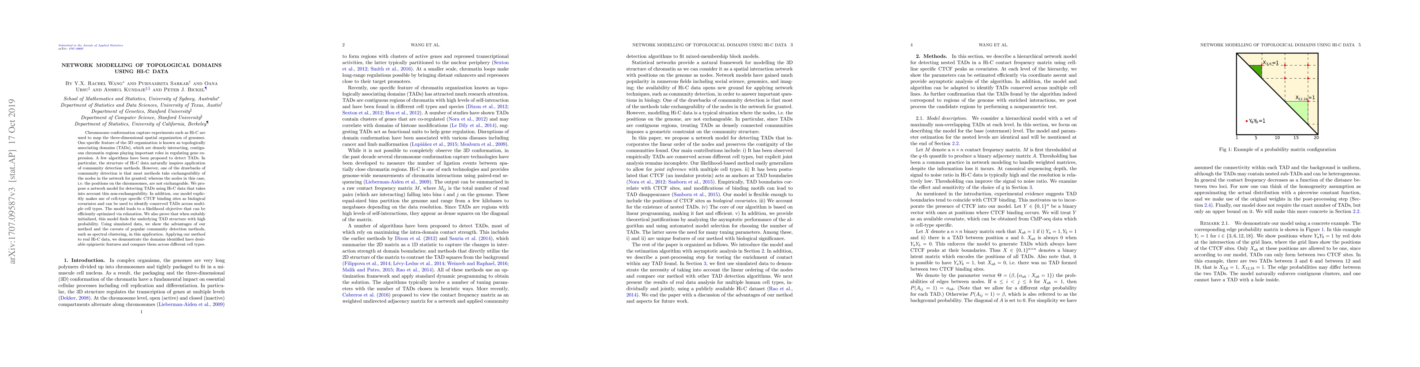 Chromosome conformation capture experiments such as Hi-C are used to map the three-dimensional spatial organization of genomes. One specific feature of the 3D organization is known as topologically associating domains (TADs), which are densely interacting, contiguous chromatin regions playing important roles in regulating gene expression. A few algorithms have been proposed to detect TADs. In particular, the structure of Hi-C data naturally inspires application of community detection methods. However, one of the drawbacks of community detection is that most methods take exchangeability of the nodes in the network for granted; whereas the nodes in this case, i.e. the positions on the chromosomes, are not exchangeable. We propose a network model for detecting TADs using Hi-C data that takes into account this non-exchangeability. In addition, our model explicitly makes use of cell-type specific CTCF binding sites as biological covariates and can be used to identify conserved TADs across multiple cell types. The model leads to a likelihood objective that can be efficiently optimized via relaxation. We also prove that when suitably initialized, this model finds the underlying TAD structure with high probability. Using simulated data, we show the advantages of our method and the caveats of popular community detection methods, such as spectral clustering, in this application. Applying our method to real Hi-C data, we demonstrate the domains identified have desirable epigenetic features and compare them across different cell types.