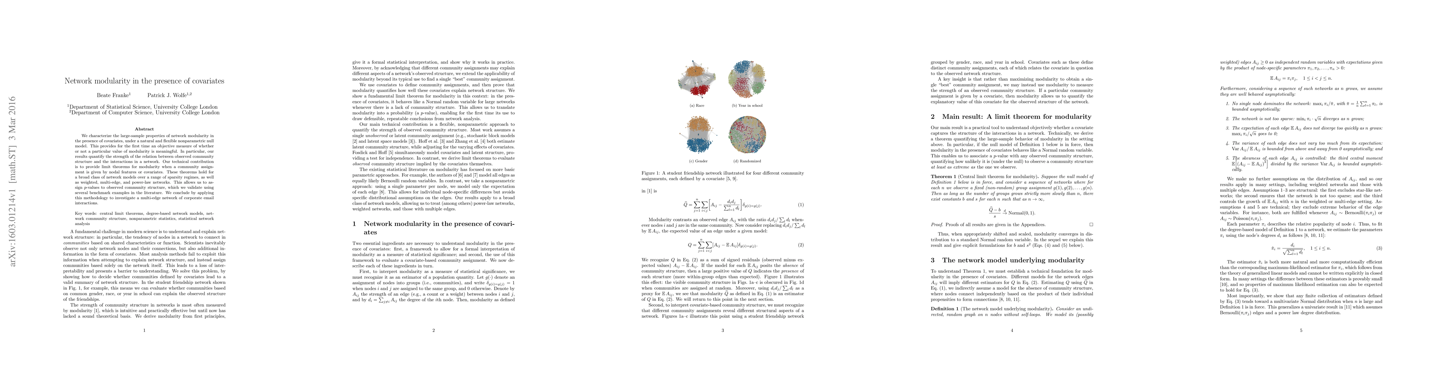 We characterize the large-sample properties of network modularity in the presence of covariates, under a natural and flexible nonparametric null model. This provides for the first time an objective measure of whether or not a particular value of modularity is meaningful. In particular, our results quantify the strength of the relation between observed community structure and the interactions in a network. Our technical contribution is to provide limit theorems for modularity when a community assignment is given by nodal features or covariates. These theorems hold for a broad class of network models over a range of sparsity regimes, as well as weighted, multi-edge, and power-law networks. This allows us to assign $p$-values to observed community structure, which we validate using several benchmark examples in the literature. We conclude by applying this methodology to investigate a multi-edge network of corporate email interactions.
