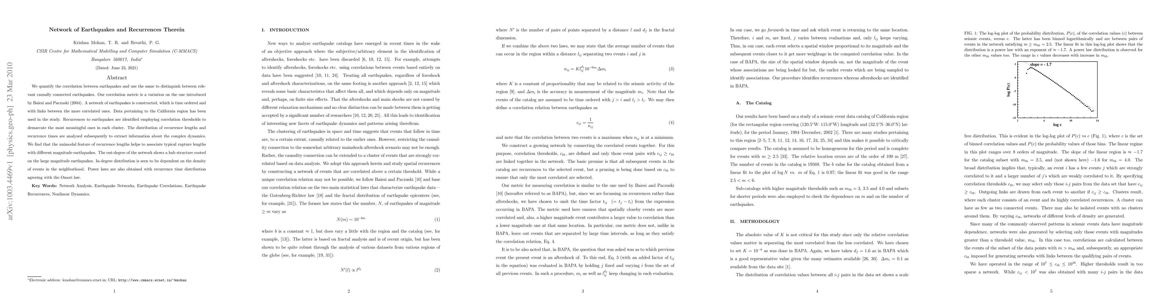 We quantify the correlation between earthquakes and use the same to distinguish between relevant causally connected earthquakes. Our correlation metric is a variation on the one introduced by Baiesi and Paczuski (2004). A network of earthquakes is constructed, which is time ordered and with links between the more correlated ones. Data pertaining to the California region has been used in the study. Recurrences to earthquakes are identified employing correlation thresholds to demarcate the most meaningful ones in each cluster. The distribution of recurrence lengths and recurrence times are analyzed subsequently to extract information about the complex dynamics. We find that the unimodal feature of recurrence lengths helps to associate typical rupture lengths with different magnitude earthquakes. The out-degree of the network shows a hub structure rooted on the large magnitude earthquakes. In-degree distribution is seen to be dependent on the density of events in the neighborhood. Power laws are also obtained with recurrence time distribution agreeing with the Omori law.