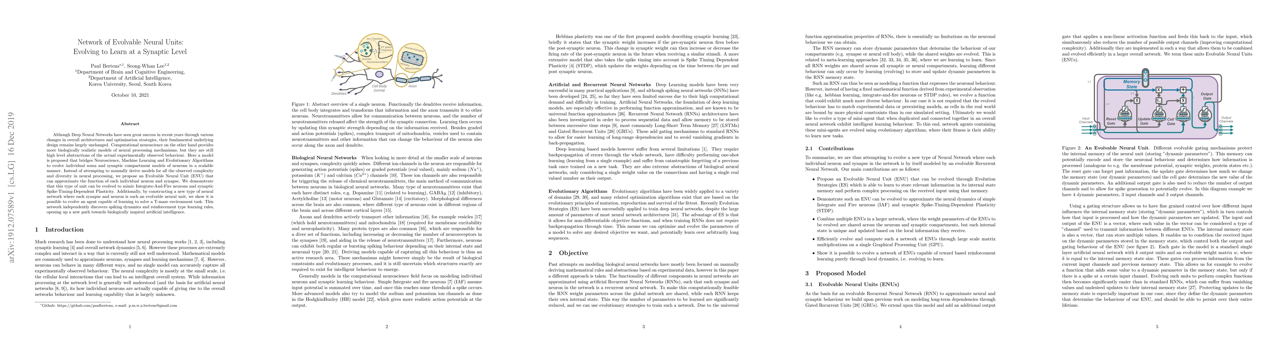 This paper proposes an Evolvable Neural Unit (ENU) model that combines neuroscience, machine learning, and evolutionary algorithms to evolve individual neuron and synapse models. The ENU network demonstrates the ability to learn and solve complex tasks, such as navigating a T-maze environment, by discovering spiking dynamics and reinforcement learning rules autonomously.