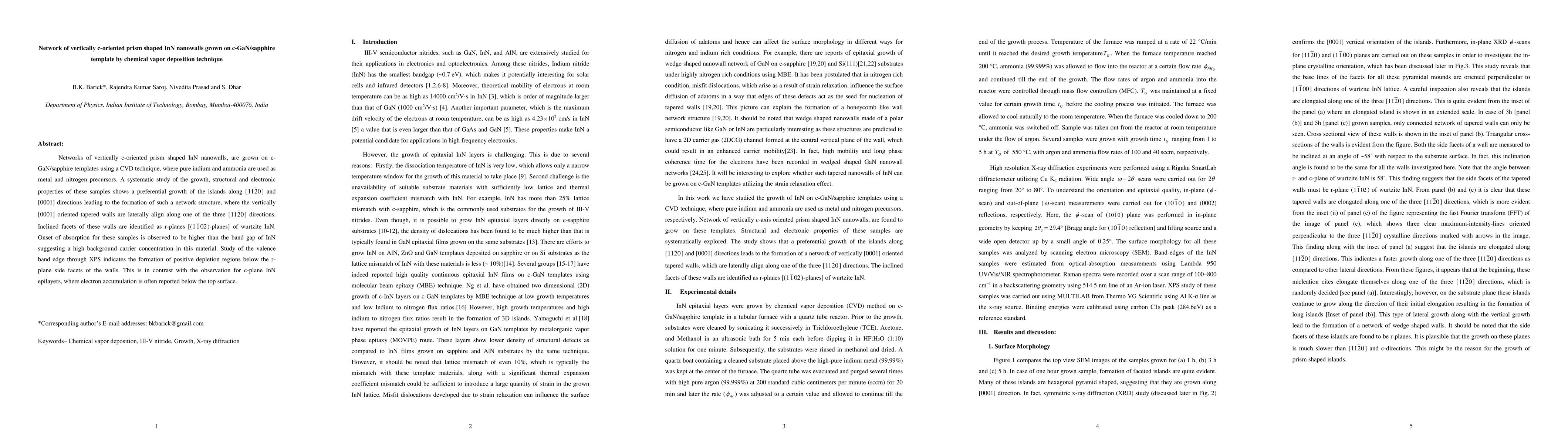 Networks of vertically c-oriented prism shaped InN nanowalls, are grown on c-GaN/sapphire templates using a CVD technique, where pure indium and ammonia are used as metal and nitrogen precursors. A systematic study of the growth, structural and electronic properties of these samples shows a preferential growth of the islands along [11-20] and [0001] directions leading to the formation of such a network structure, where the vertically [0001] oriented tapered walls are laterally align along one of the three [11-20] directions. Inclined facets of these walls are identified as r-planes [(1-102)-planes] of wurtzite InN. Onset of absorption for these samples is observed to be higher than the band gap of InN suggesting a high background carrier concentration in this material. Study of the valence band edge through XPS indicates the formation of positive depletion regions below the r-plane side facets of the walls. This is in contrast with the observation for c-plane InN epilayers, where electron accumulation is often reported below the top surface.