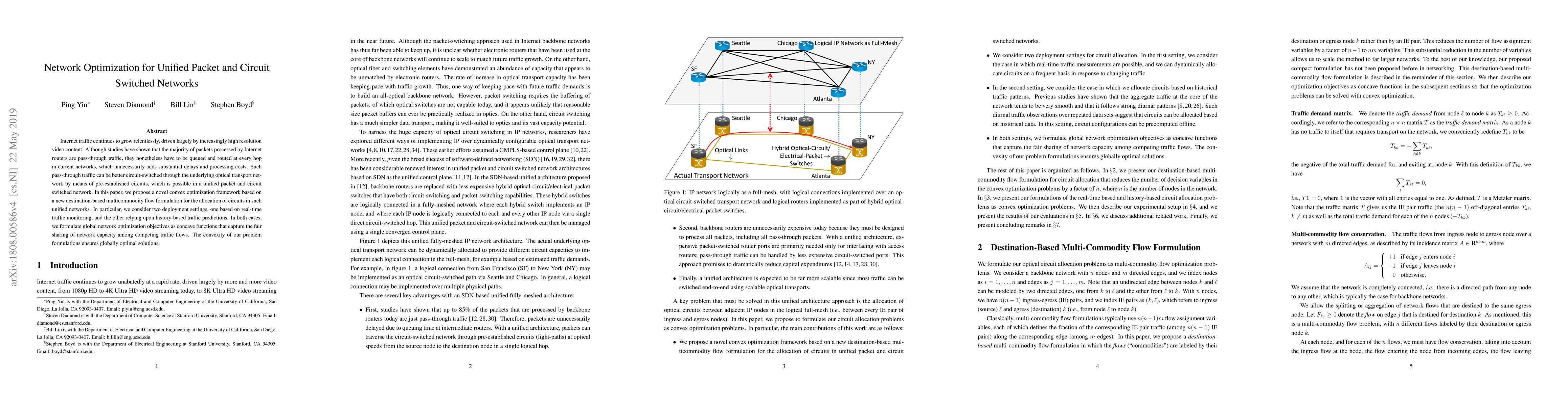 This paper proposes a convex optimization framework for optimizing unified packet and circuit-switched networks, aiming to reduce delays and processing costs by circuit-switching pass-through traffic through pre-established optical circuits. The framework formulates global optimization objectives as concave functions to ensure fair capacity sharing among traffic flows, with globally optimal solutions guaranteed by the convexity of the problem.
