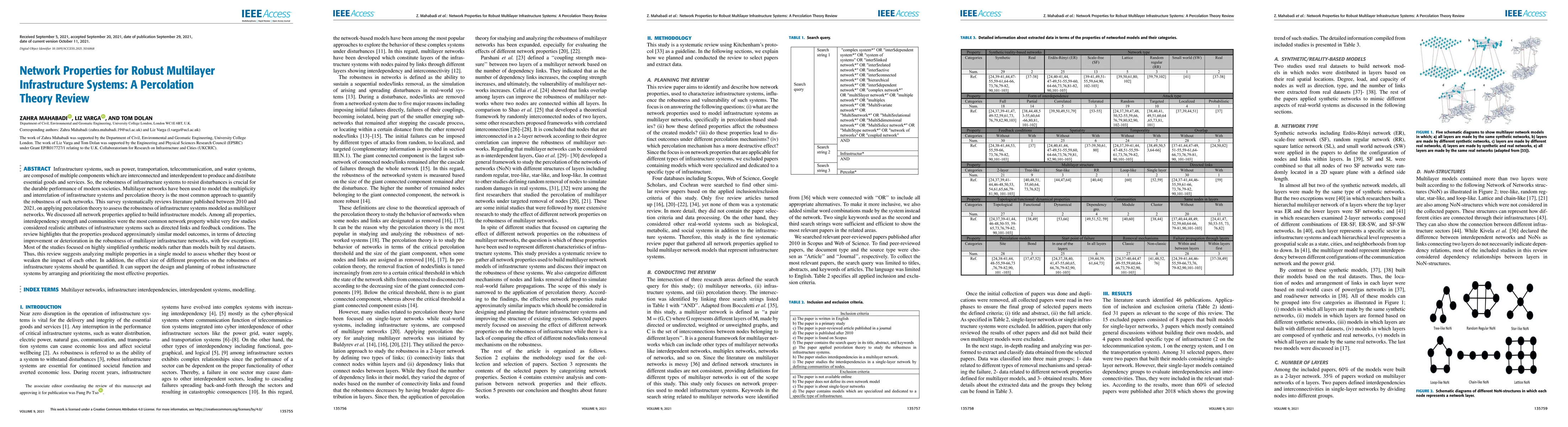 Infrastructure systems, such as power, transportation, telecommunication, and water systems, are composed of multiple components which are interconnected and interdependent to produce and distribute essential goods and services. So, the robustness of infrastructure systems to resist disturbances is crucial for the durable performance of modern societies. Multilayer networks have been used to model the multiplicity and interrelation of infrastructure systems and percolation theory is the most common approach to quantify the robustness of such networks. This survey systematically reviews literature published between 2010 and 2021, on applying percolation theory to assess the robustness of infrastructure systems modeled as multilayer networks. We discussed all network properties applied to build infrastructure models. Among all properties, interdependency strength and communities were the most common network property whilst very few studies considered realistic attributes of infrastructure systems such as directed links and feedback conditions. The review highlights that the properties produced approximately similar model outcomes, in terms of detecting improvement or deterioration in the robustness of multilayer infrastructure networks, with few exceptions. Most of the studies focused on highly simpliffied synthetic models rather than models built by real datasets. Thus, this review suggests analyzing multiple properties in a single model to assess whether they boost or weaken the impact of each other. In addition, the effect size of different properties on the robustness of infrastructure systems should be quantiffied. It can support the design and planning of robust infrastructure systems by arranging and prioritizing the most effective properties.