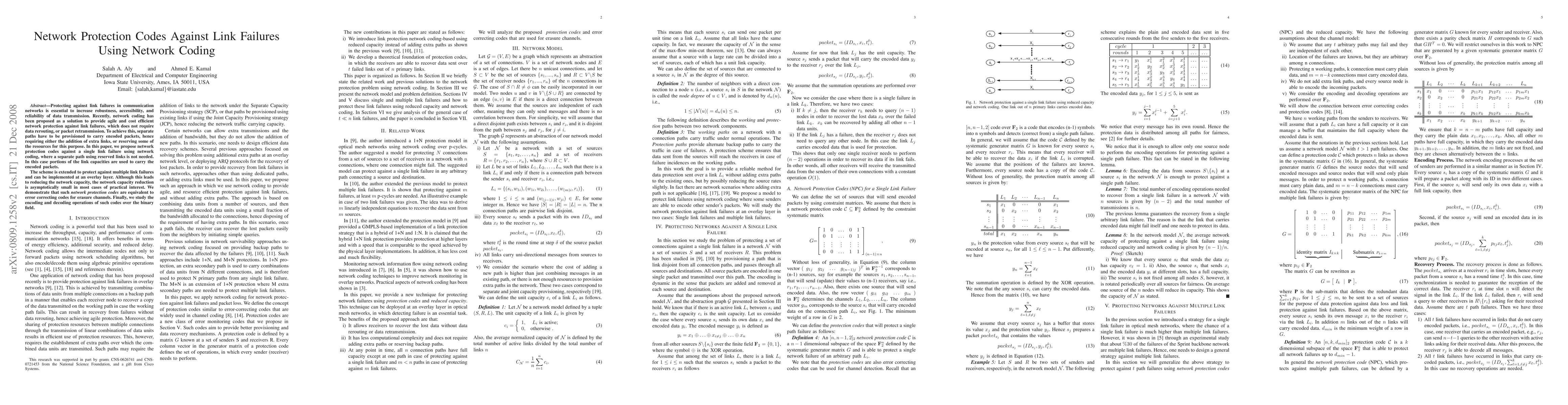 This paper proposes network protection codes using network coding to safeguard against link failures without requiring additional paths or resources, thus maintaining network efficiency and capacity. The scheme is extended to handle multiple link failures, showing minimal asymptotic capacity reduction and equivalence to error correcting codes for erasure channels.